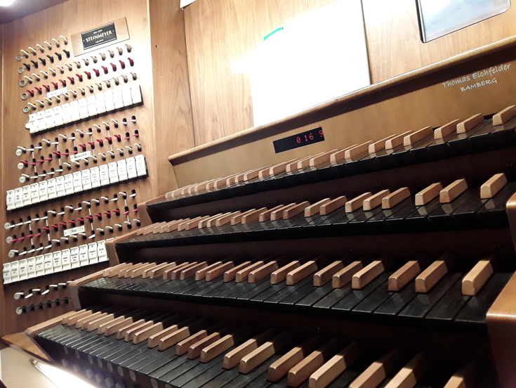 Einen Klangeindruck der großen Steinmeyer-Orgel können Sie durch die im Jahr 2020 entstandene CD gewinnen. Kantor Martin Seiwert spielt Werke von J. S. Bach, R. Schumann und M. Reger. Die CD ist im Pfarrbüro, in der Sakristei nach den Gottesdiensten oder bei Konzerten zum Einführungspreis von 10,00 € erhältich.