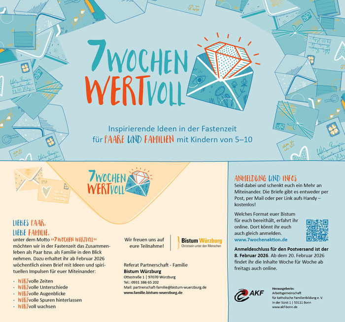 unter dem Motto >>7 Wochen WERTvoll<< möchten wir in der Fastenzeit das Zusammenleben als Paar bzw. als Familie in den Blick nehmen. Dazu erhaltet ihr ab Februar 2026 wöchentlich einen Brief mit Ideen und spirituellen Impulsen für euer Miteinander:
