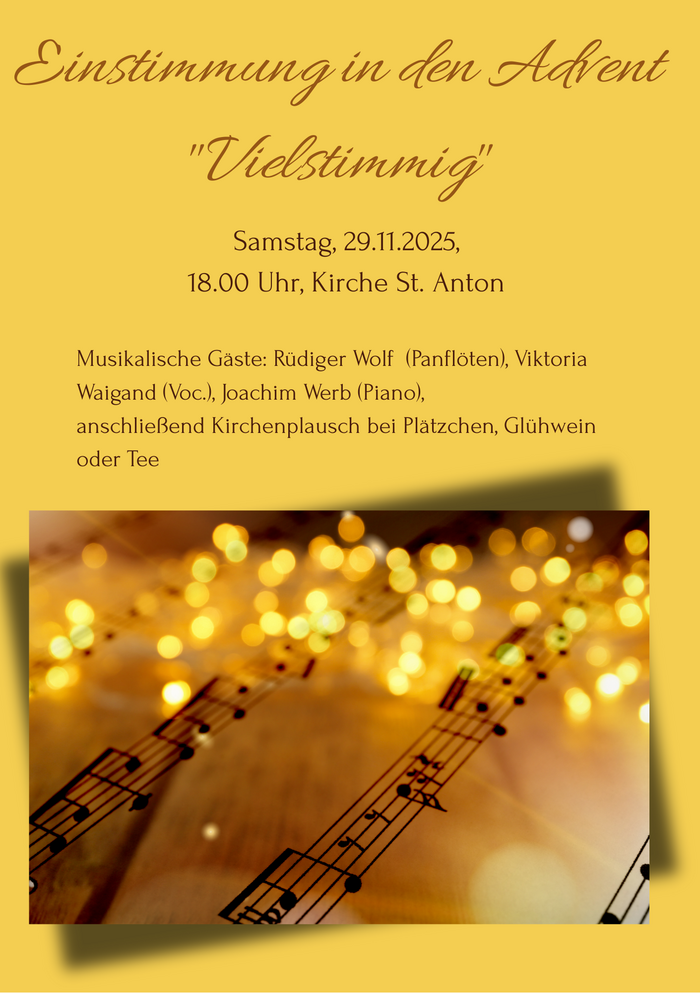 Der Grundakkord des Advents wird bei dieser vielstimmigen Stunde am ersten Adventswochende zu hören und zu spüren sein. Diakon Joachim Werb mit seinen Gästen bietet zu den Tönen, Liedern (auch zum Mitsingen) und „Klängen“ ein besonders vielseitiges Programm für Ohr und Herz an. Klassiker der Adventszeit, beeindruckende „mehrstimmige“ Panflötenstücke und die markante Bluesstimme von Viktoria Waigand bieten neben den Textimpulsen viele Möglichkeiten, abzuschalten, umzuschalten und den Advent als echte Umkehrzeit bei sich ankommen zu lassen.