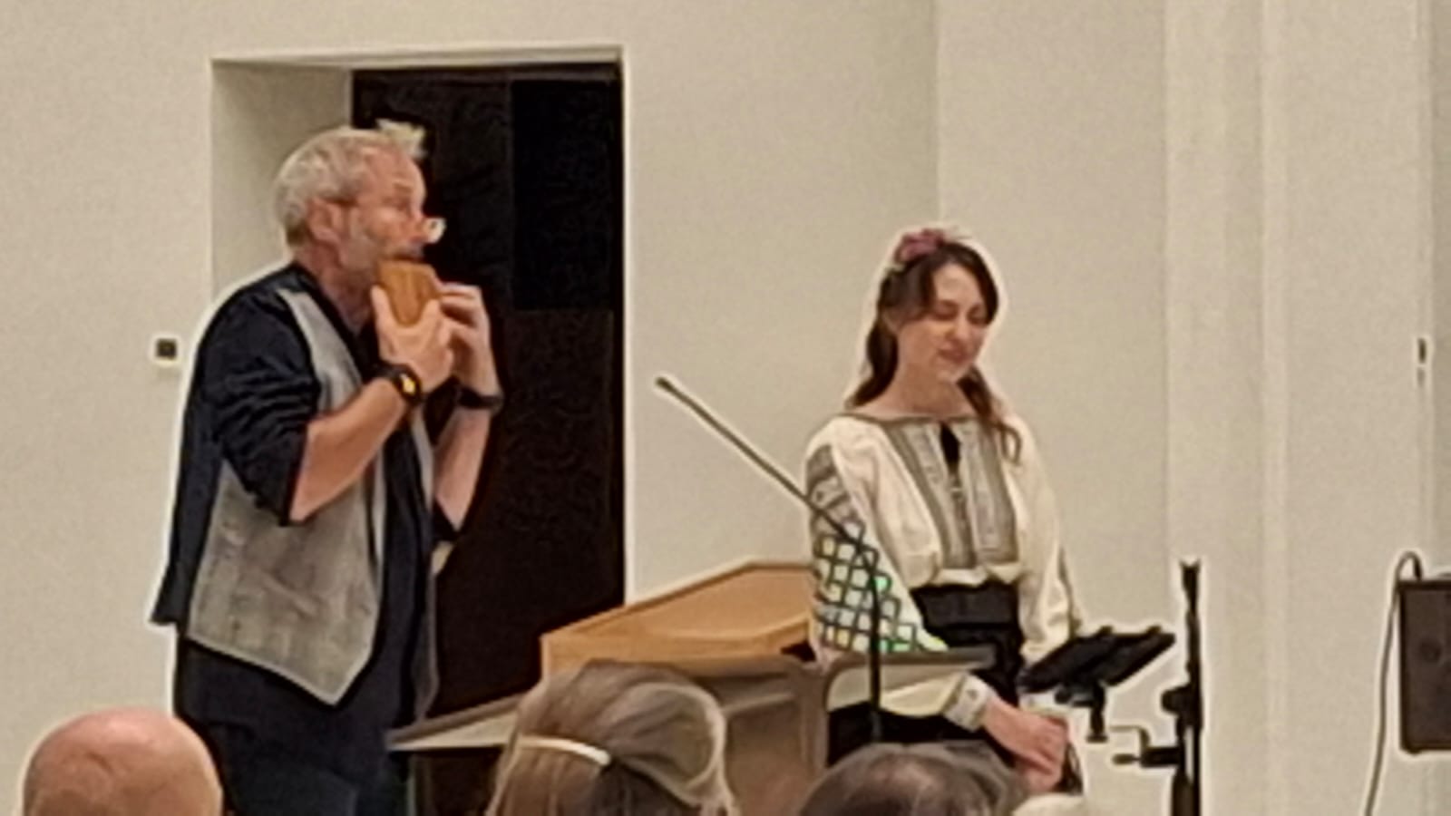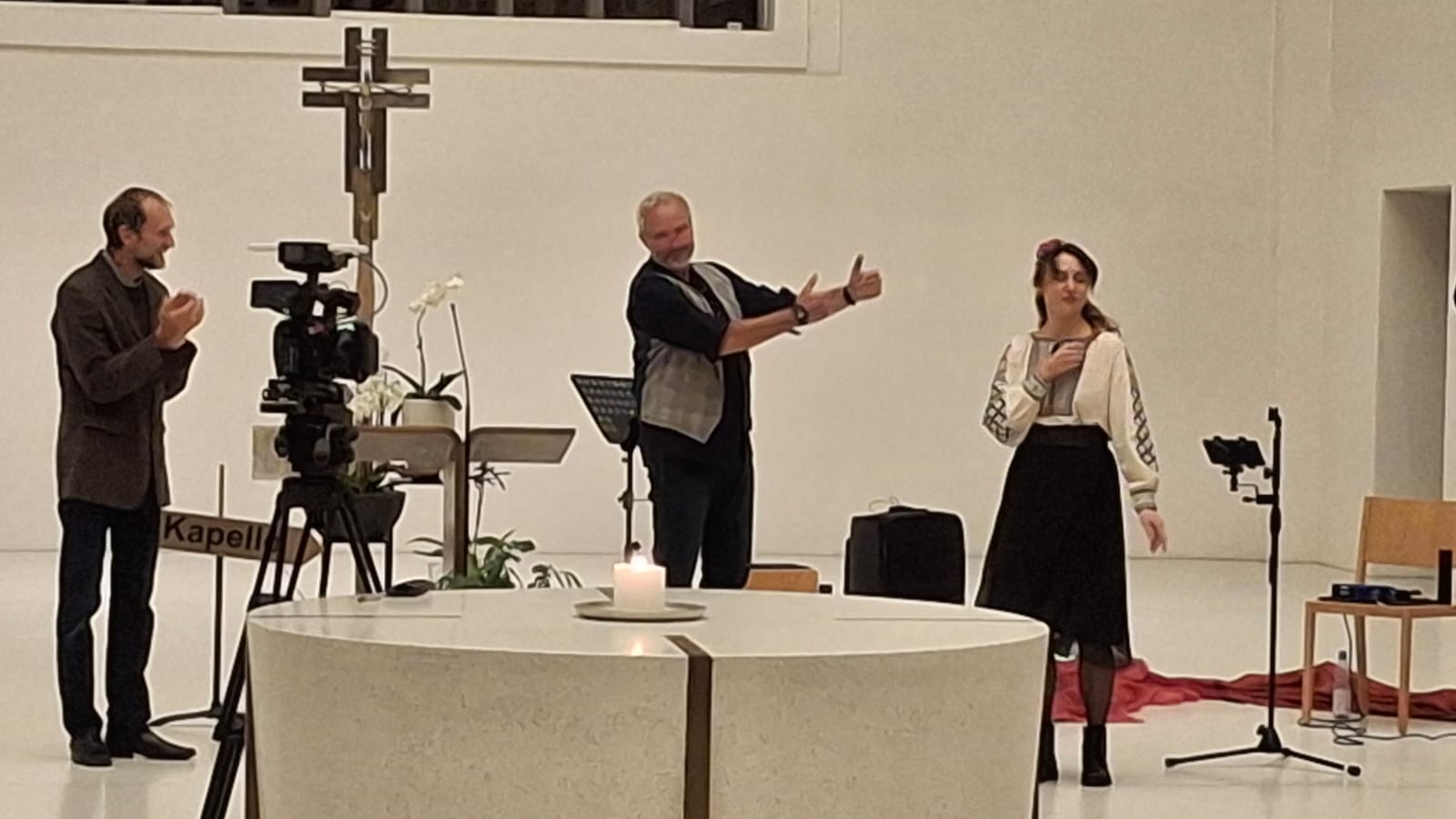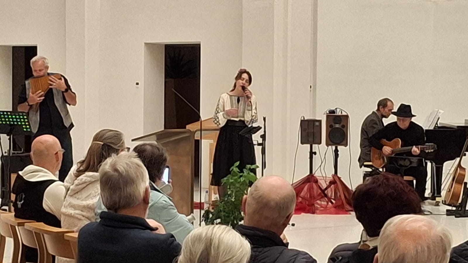 Die gebürtige Ukrainerin Tetiana Makarova überzeugte mit ihrer professionellen Stimme und sensiblen Gestik, die sowohl die feinfühligen wie eindrucksvollen Parts der unterschiedlichsten Genres dieses Musikabends zusammenführte. Vom ukrainisch/polnischen Volkslied, über Jazz- und Soulstandards bis hin zu markante Eigenkompositionen bot das Ensemble ein abwechslungsreiches Repertoire ihres gemeinsamen Wirkens. Sensibel, gekonnt und auf höchstem Niveau begleitete Jyn Gnyp die Stimme mit seinem Gitarrenspiel, dass sich stets in das Musikgeschehen harmonisch einfügte. Rhythmische Unterstützung und ebenfalls feinfühlige Begleitung fanden Stimme und Gitarre durch das Cajon von Rüdiger Wolf. Erstaunlich, welche Nuancen und Klänge er diesem eher rustikalen Instrument entlockte. Seine zweite Leidenschaft, die Panflöte, durfte natürlich auch nicht fehlen und setzte einen weiteren Glanzpunkt an diesem Abend.