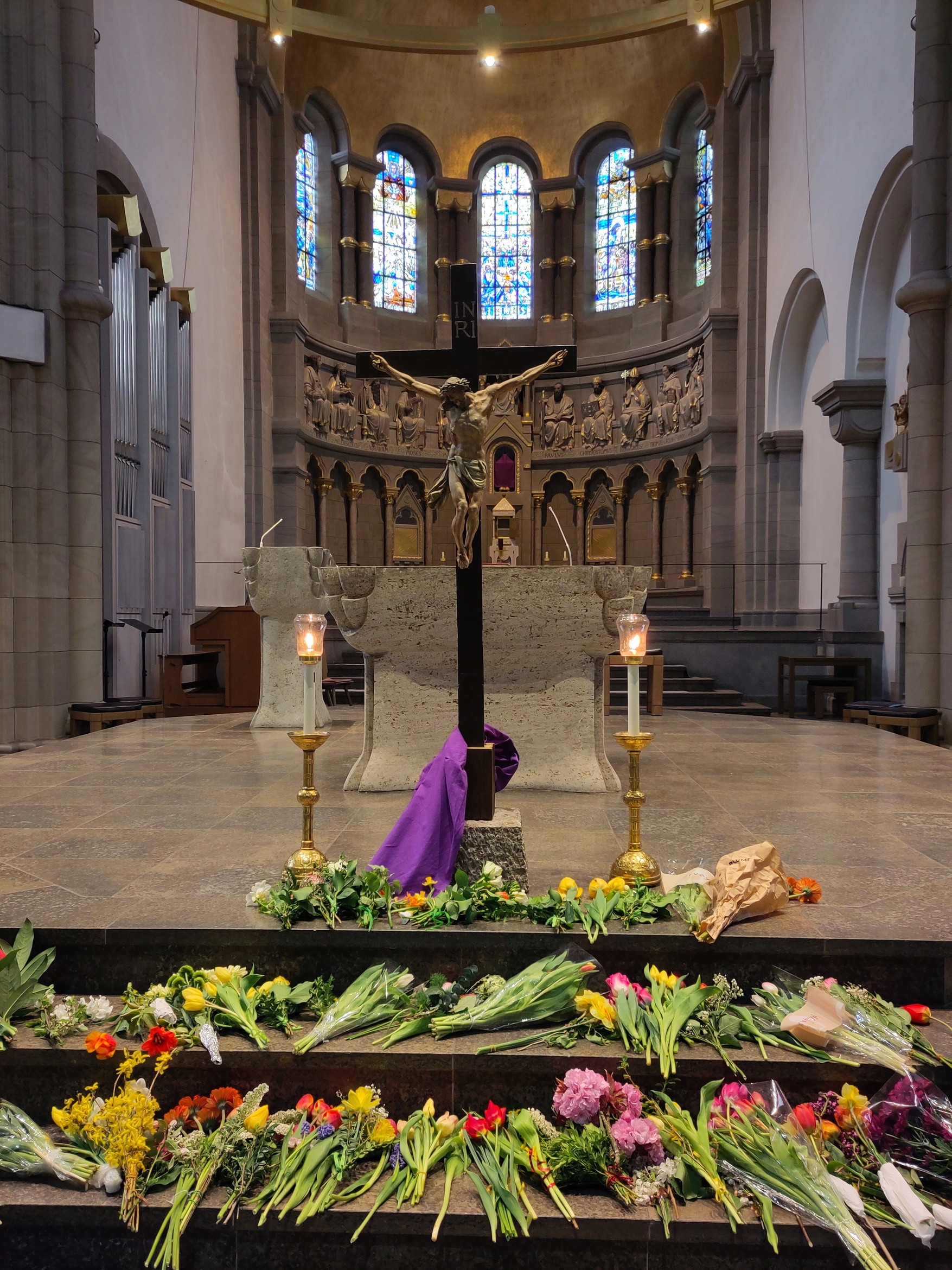 Für uns kommt es darauf an, dass wir uns auf dem Weg der Menschlichkeit von Jesus in Mit-Leidenschaft ziehen lassen. Das Kreuz, das wir nun gleich verehren werden, steht dabei für eine Haltung, für SEINE Haltung: Bodenständig sein, in den Himmel ausgerichtet, wie der Längsbalken und solidarisch handelnwofür der Querbalken steht. „O heil’ges Kreuz sei uns gegrüßt, du unsre einz’ge Hoffnung bist“, bekommt damit einen Sinn.