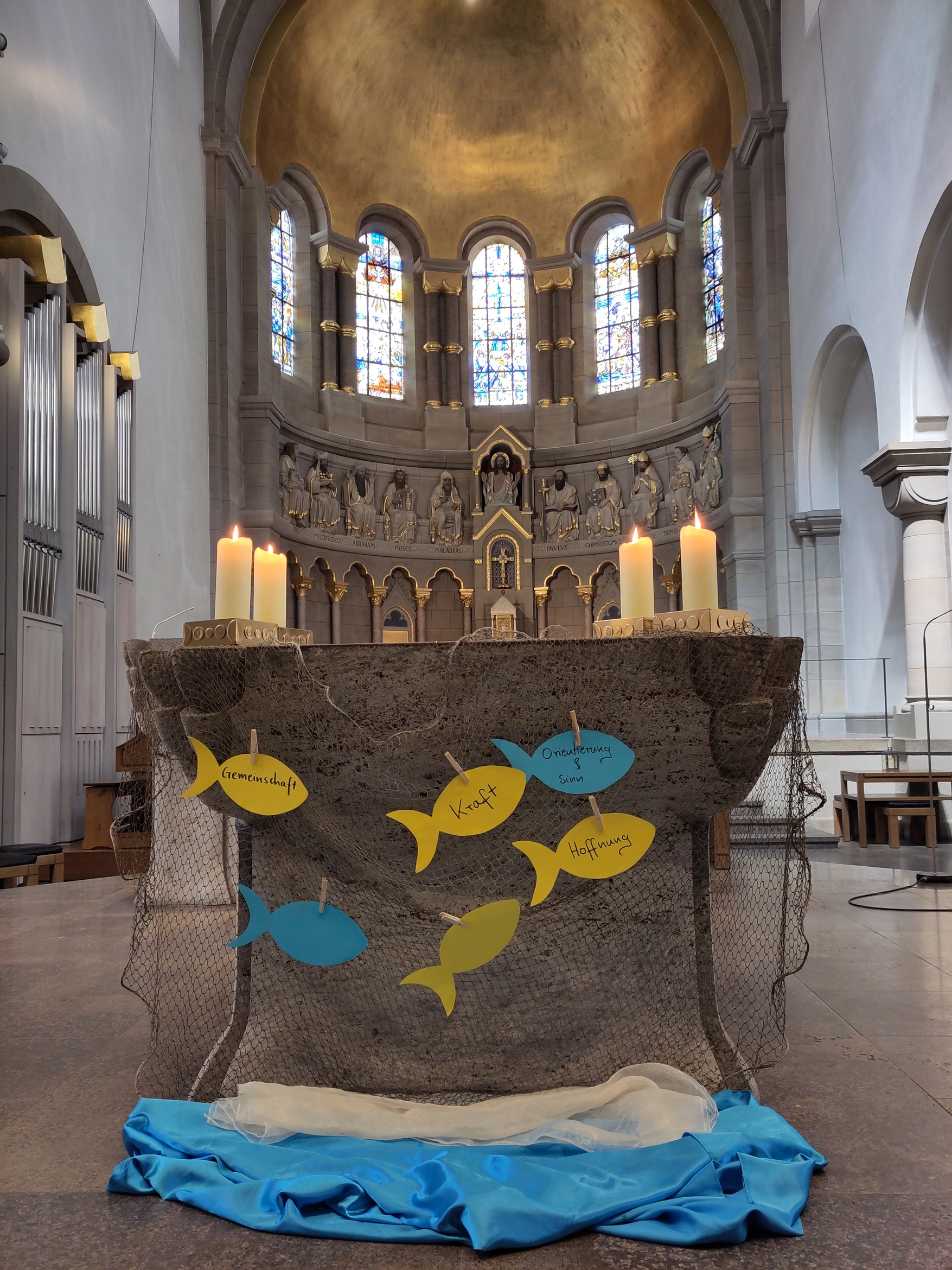 Auf diese Fragen gibt es keine allgemeine Antwort; jeder und jede muss ihnen für sich individuell nachgehen. Ich kann nur von mir erzählen, wo der Glaube meine Lebensnetze füllt (Für jeden Gedanken wird ein Fisch in das Netz am Altarraum gesteckt - siehe Bild):