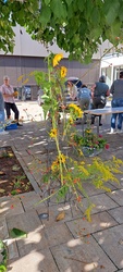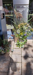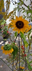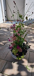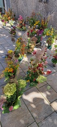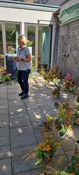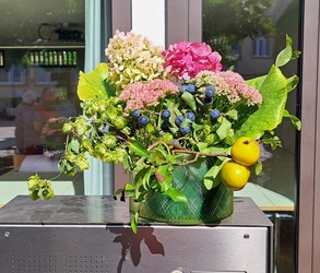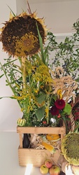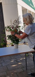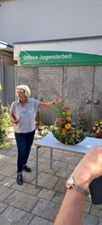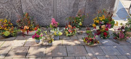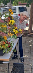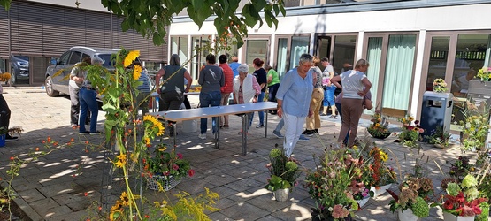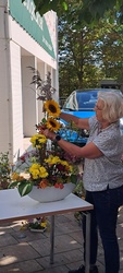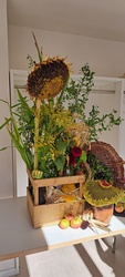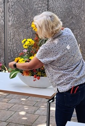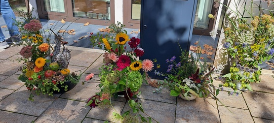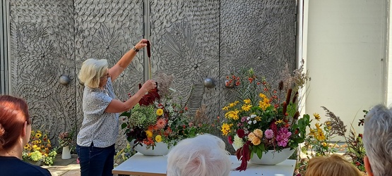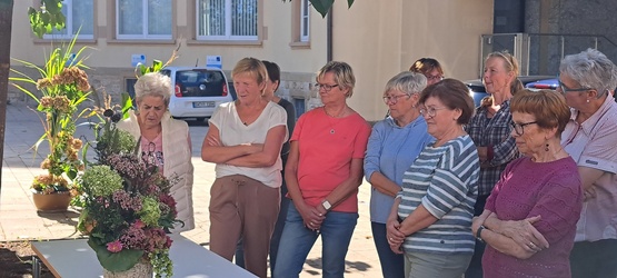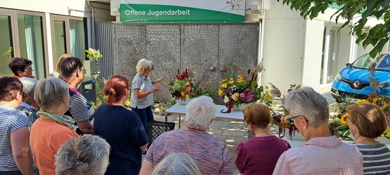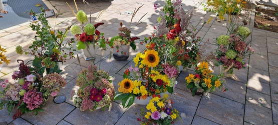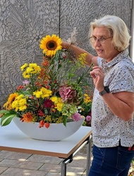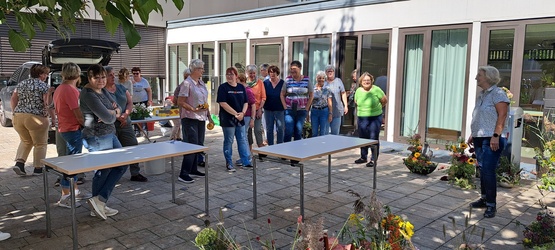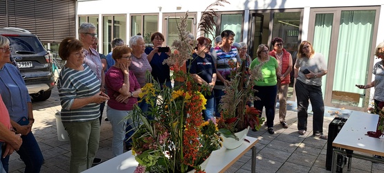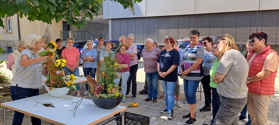 Am Nachmittag setzten die Teilnehmerinnen das Gelernte praktisch um. Mit viel Geschick entstanden kunstvolle Blumengestecke, die das Thema Erntedank in seiner Vielfalt widerspiegelten – von Sonnenblumen und Lampionblumen über Früchte und Fruchtstände bis hin zu herbstlich verwelkten Blättern. Zum Abschluss wurden die Werke gemeinsam betrachtet und besprochen. Frau Höchemer gab hilfreiche Tipps, wie z.B. durch reduzierte Gestaltung, räumliche Tiefe oder die bewusste Wiederholung von Farben die Wirkung verstärkt werden kann.