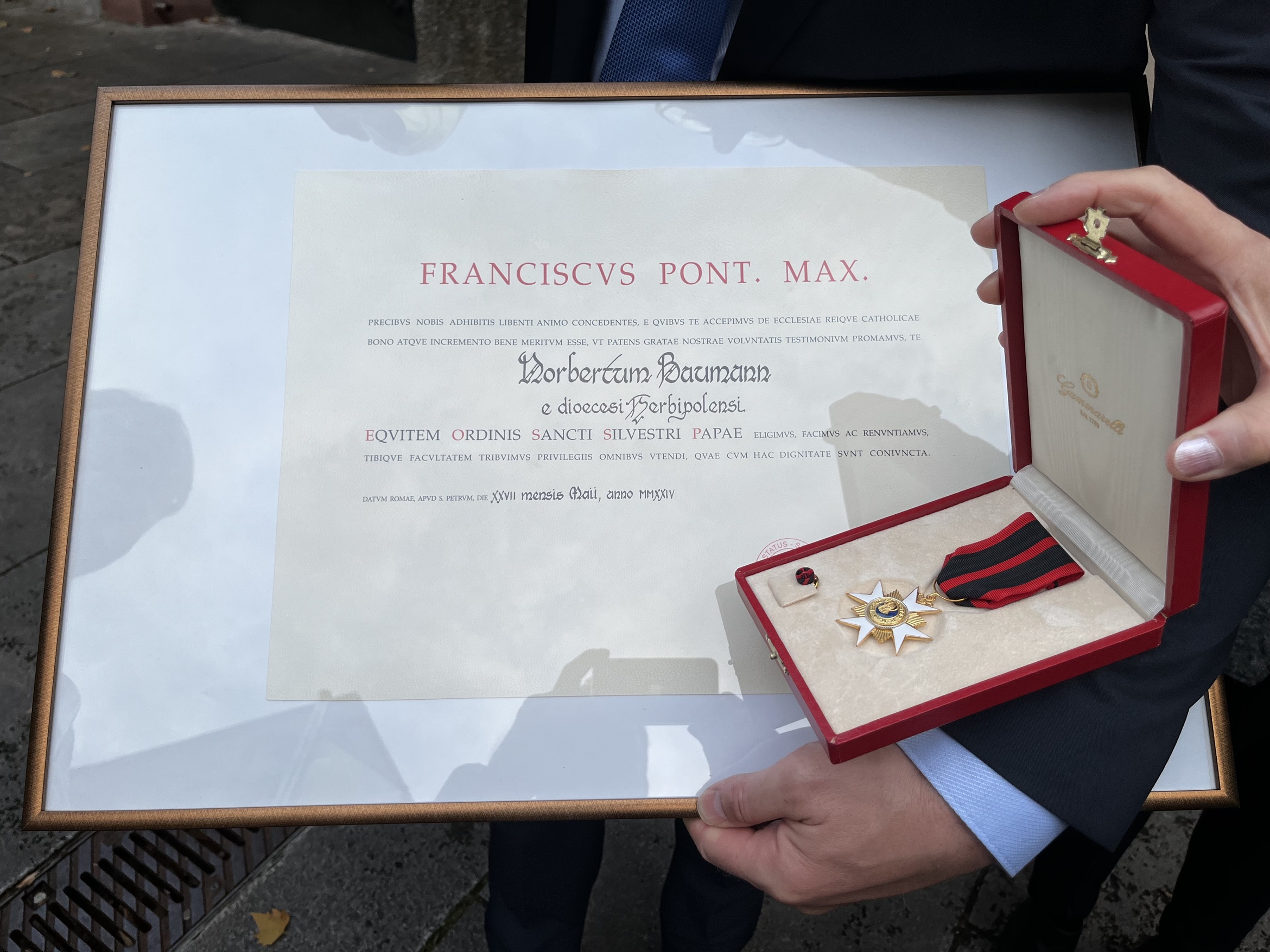 Darunter der Schweinfurter Norbert Baumann, der mit dem Silvester Orden des Bistums (päpstlicher Orden für die Verdienste um die römisch-katholische Kirche) ausgezeichnet wurde. Besondere Würdigung erfuhr dabei seine 8 jährige Tätigkeit im Diözesanrat als Vorsitzender, das Engagement im ZdK und im Landeskomitee, sein Einsatz für Donum Vitae und seine umfangreichen Einsätze für die Pfarrei Maximilian Kolbe in Schweinfurt.