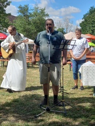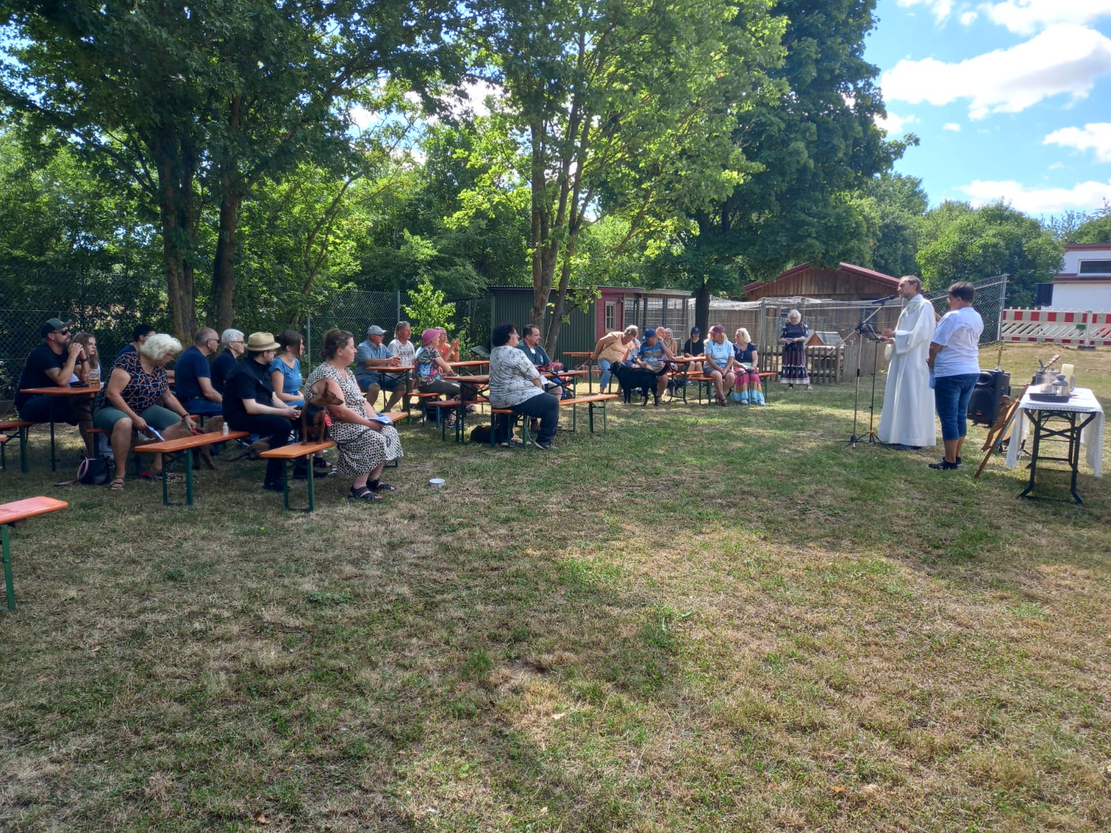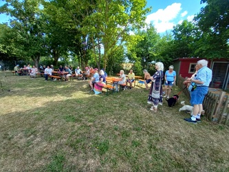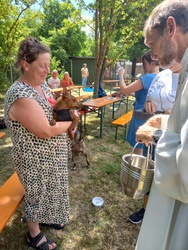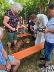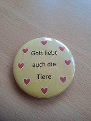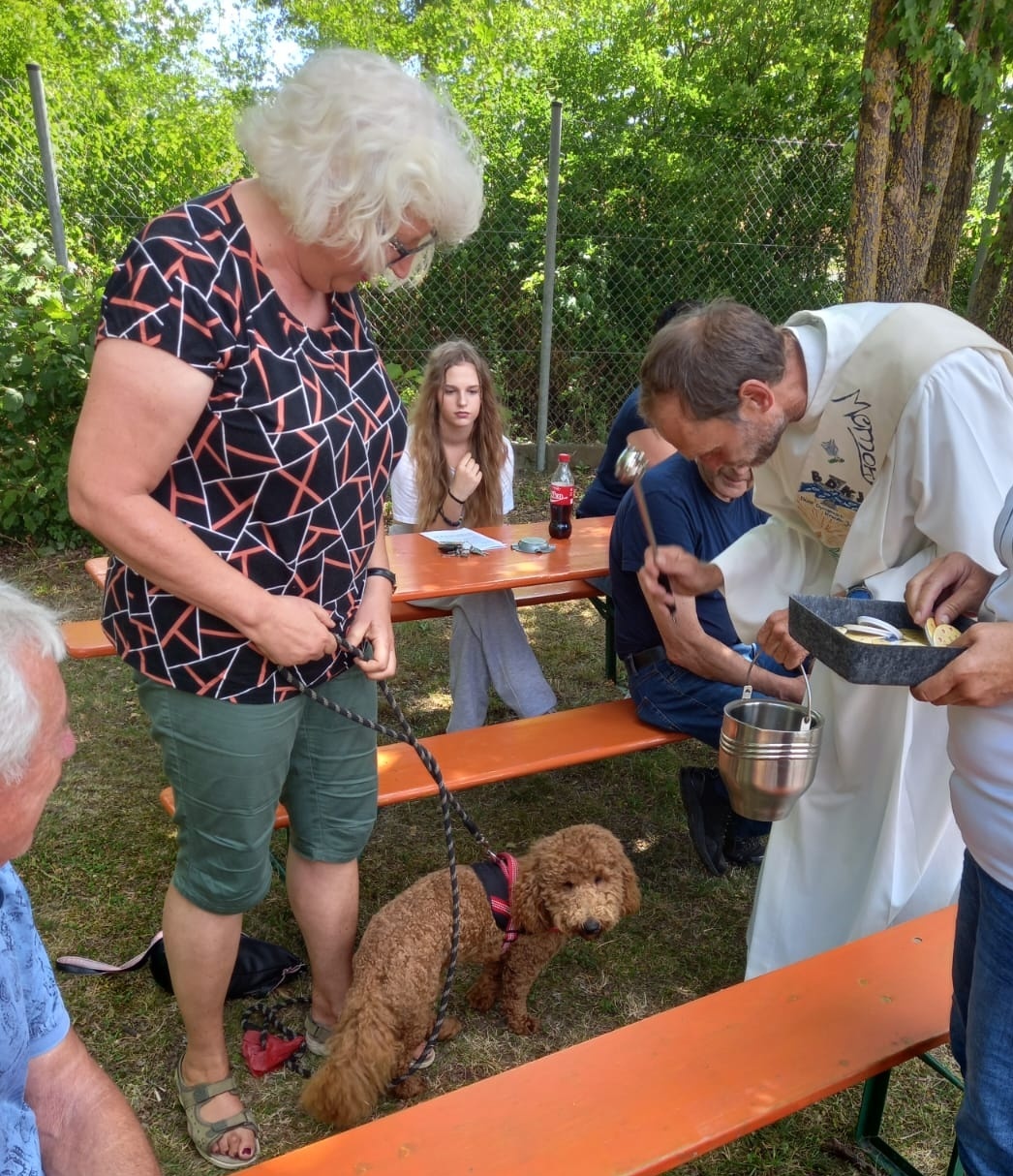 Nach dem allgemeinen Segen wurden die anwesenden Tiere, ausschließlich Hunde, einzeln gesegnet. Sie reagierten sehr unterschiedlich auf das Besprengen mit Weihwasser, neugierig, schreckhaft oder tiefenentspannt. Zur Erinnerung an diese Feier überreichte Gabi Treutlein den Besitzern einen Button mit der Aufschrift „Gott liebt auch die Tiere“.