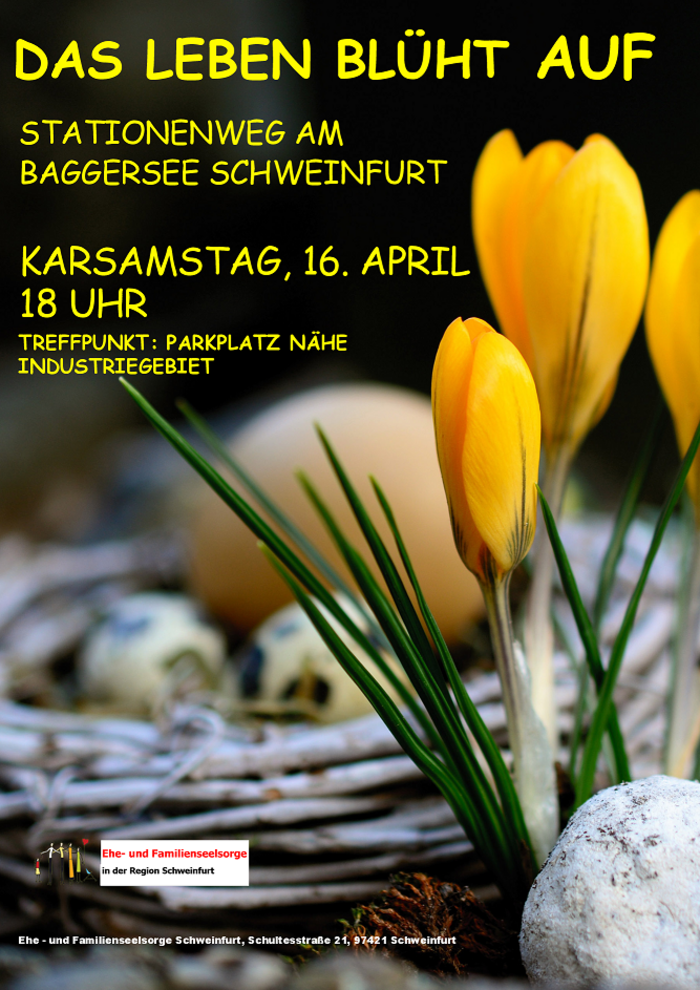 Die Ehe- und Familienseelsorge Schweinfurt bietet am Karsamstag einen Stationenweg zur Passion und Ostern rund um den Baggersee Schweinfurt an. Vier unterschiedlich gestaltete Stationen im Freien laden dazu ein, zunächst dem Passionsgeschehen und dann auch dem Osterfest auf die Spur zu kommen. Die Zeit ist bewusst flexibel gehalten, so dass man im Zeitraum zwischen 18 und 19 Uhr den Rundweg starten kann.