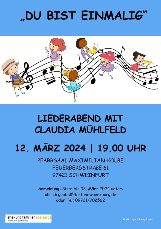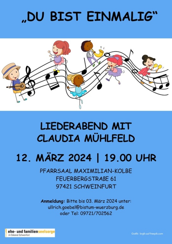 Gemeinsam wollen wir an diesem Abend Lieder singen zum Motto: „Du bist einmalig“ - nach dem Buch v. Max Lucado, wozu es im „KiZ“ schon ein Musical gegeben hat. Dazu wird uns die Liedermacherin Claudia Mühlfeld neue, beschwingte Lieder vorstellen. Die Veranstaltung findet im Pfarrsaal von Maximilian Kolbe Schweinfurt statt und ist kostenlos.