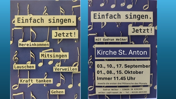 Gudrun Welker lädt ein zu einer musikalischen Mittagspause in St. Anton. Immer an den ersten drei Mittwochen eines Monats startet diese abwechslungsreiche und meditative Mittagspause um 11.45 Uhr. Ohne Anmeldung und kostenfrei bietet sie eine Gelegenheit, dem Alltag zu entfliehen, Kraft zu tanken und zur Ruhe zu kommen - sei es durch Mitsingen, Verweilen, Zuhören oder stilles Gebet. Jeder ist willkommen, ein Kommen und Gehen ist jederzeit möglich.