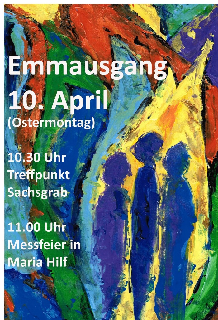 Von dort aus führt der Weg, von Impulsen begleitet, zur Kirche Maria Hilf. "Unheilige" Gedanken der gleichnamigen bekannten Künstler regen an, sich dem Emmausgeschehen auf neue Weise zu nähern. "Geboren um zu leben", aber auch die Schwere des produktiven Umgangs mit Trauer werden thematisiert, denn es ist schwer Neues zuzulassen, wenn die Trauer mutlos macht. Die Erfahrungen der Jünger auf dem Weg nach Emmaus bieten jedem Interessierten Anknüpfungspunkte für die persönliche Begegnung mit dem auferstandenen Christus. Die besondere Form des "Gottesdienstes unterwegs" verspricht durch die engagierte und qualifizierte Vorbereitung eine spannende Begegnung mit dem Ostergeschehen, das mit dem Emmausgang zum Abschluss kommt.
