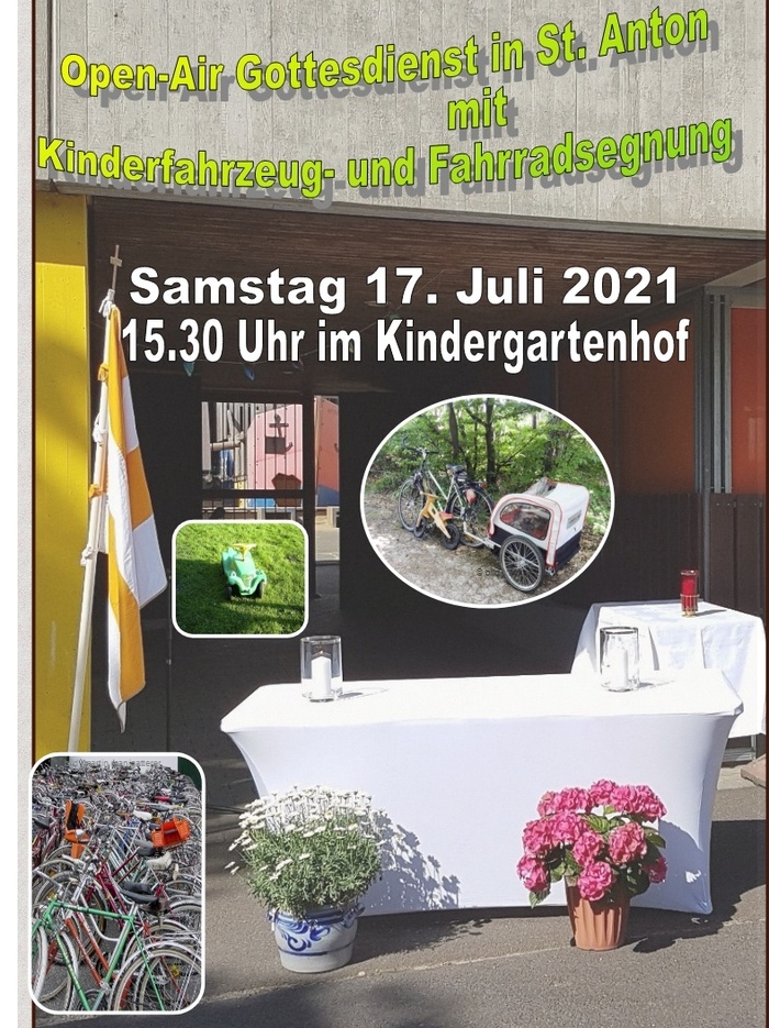 Warum hier nicht auch einmal "PARKEN um zu SEGNEN"? Das dachte sich das Gemeindeteam von St. Anton und lädt alle Nutzer und Besitzer von Kinderfahrzeugen, aber auch von Fahrrädern (mit und ohne Motor) ein, den weiteren Fahrweg "Sicher unter Gottes Schutz" zu stellen. Kinder, Jugendliche und Familien sind herzlich eingeladen, mit Fahrzeug einfach zum KiTa-Hof zu kommen, zu "parken" und in einer kurzen Segensfeier diesen Beistand vom Himmel mitzunemen.