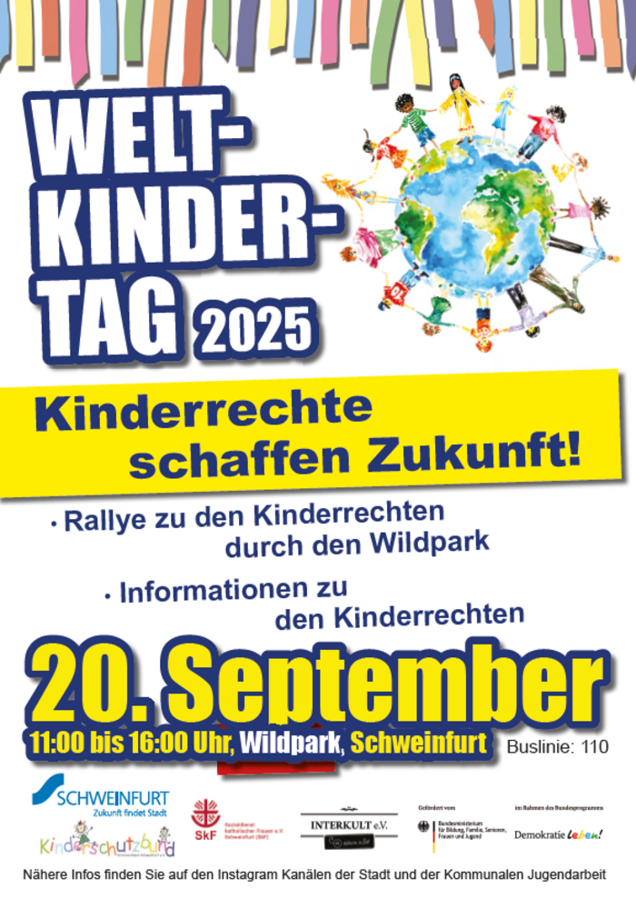 Unter dem Motto „Kinderrechte – Bausteine für Demokratie“ können Kinder mit ihren Familien am 20. September 2025 von 11:00 bis 16:00 Uhr im Wildpark Schweinfurt spielerisch die Kinderrechte entdecken und dabei kleine Preise gewinnen.