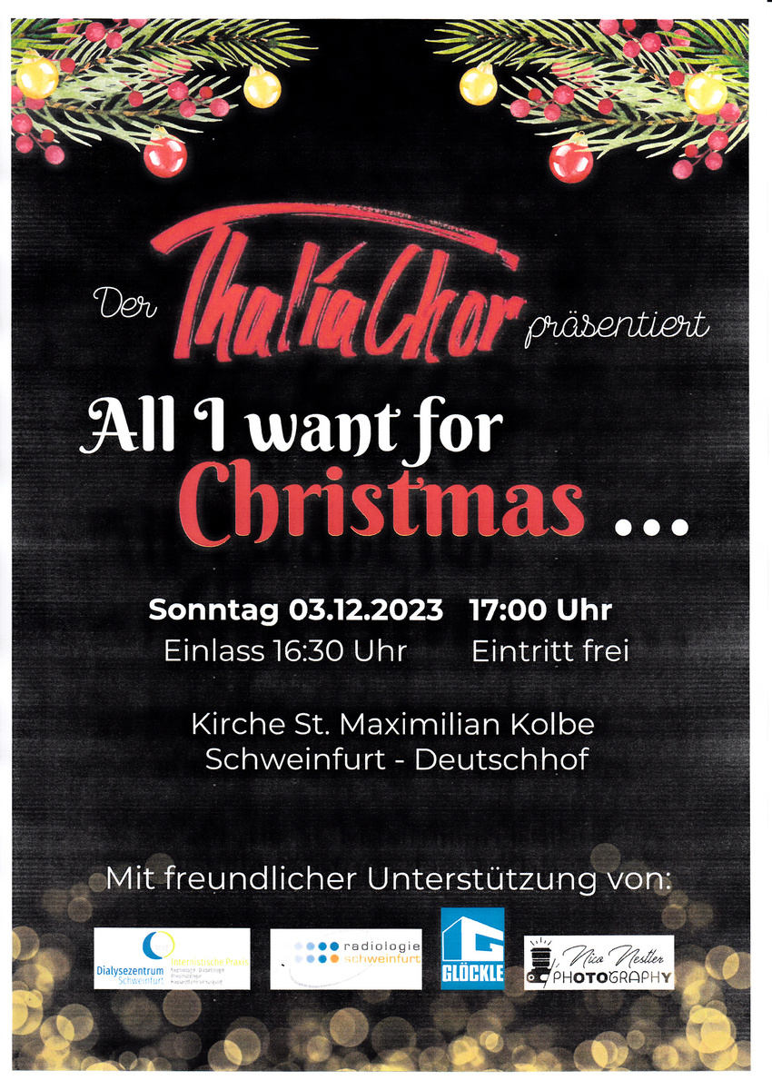 Unter dem Motto "All I want for Christmas" lädt am Sonntag, den 3.12., um 17 Uhr der Thalia Chor Schweinfurt zu einem schwungvollen, musikalischen Auftakt in die Adventszeit in die Kirche St. Maximilian Kolbe ein.