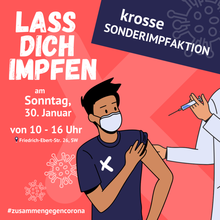 Am Sonntag, 30. Januar kannst du dich in der Zeit von 10 bis 16 Uhr ganz unkompliziert ohne Termin impfen lassen, egal ob Erst-, Zweit- oder Boosterimpfung. Komm einfach bei uns in der Friedrich-Ebert-Straße 26 vorbei und bringe deinen Impfpass und Personalausweis mit. Ein kleiner Piks, der dich und andere schützt.