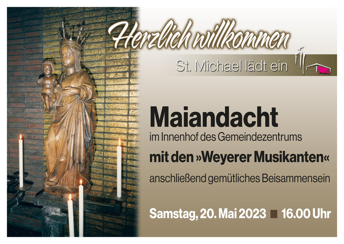 Am Samstag, 20. Mai, findet um 16 Uhr im schönen Innenhof des Gemeindezentrums St. Michael im Musikerviertel eine Maiandacht statt. Die musikalische Gestaltung übernehmen Musiker aus Weyer und Schwebheim.