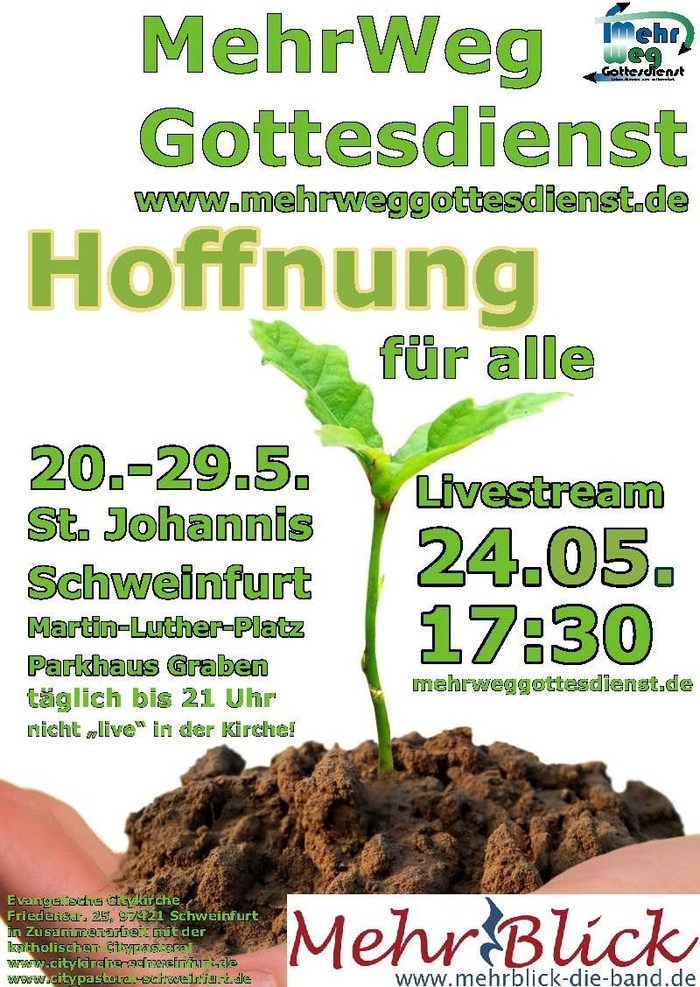 Am Sonntag, 24.5. um 17:30 wird es jedoch keinen Gottesdienst vor Ort geben. Stattdessen lädt das Team ein, via Livestream dabei zu sein und sich im Internet zu beteiligen. Alle Stationen der „MehrWegPhase“ werden auch im Internet zu sehen sein. Dort wird es ebenfalls die Möglichkeit geben, sich zu beteiligen.
