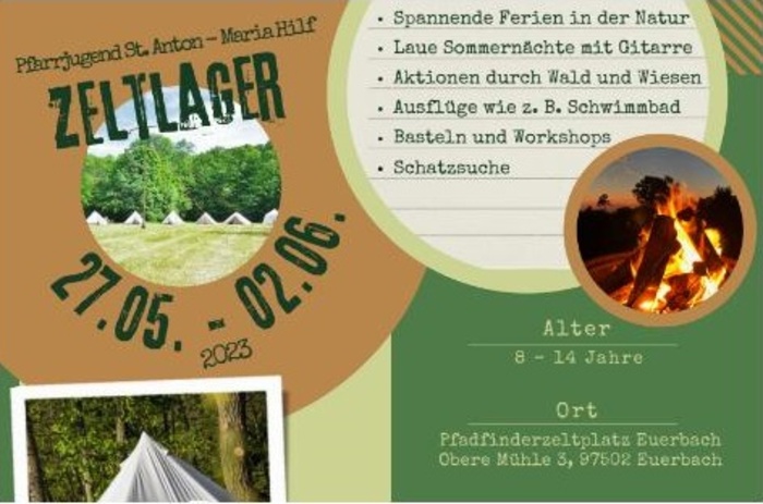 Wie jedes Jahr veranstalten wir, die Pfarrjugend St. Anton – Maria Hilf, ein Pfingstzeltlager für Kinder zwischen 8 und 14 Jahren. Dieses Jahr sind werden wir vom 27.05. bis 02.06. auf dem Pfadfinderzeltplatz Euerbach unsere Zelte aufschlagen.