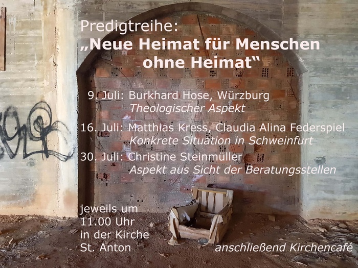 In einer neuen Predigtreihe wird das Schicksal flüchtender Menschen in den Blick genommen. Die Kommunen sehen sich durch die zunehmenden Aufgaben der Unterbringung und Integration stark herausgefordert. Das gilt auch für Schweinfurt. Welche Antworten, Ideen und Aussagen kann die Kirche zur Beheimatung fremder Menschen geben? Verkündigung wird hier konkret und in den drei Gottesdiensten werden kompetente Vertreterinnen und Vertreter zur Sprache kommen.
