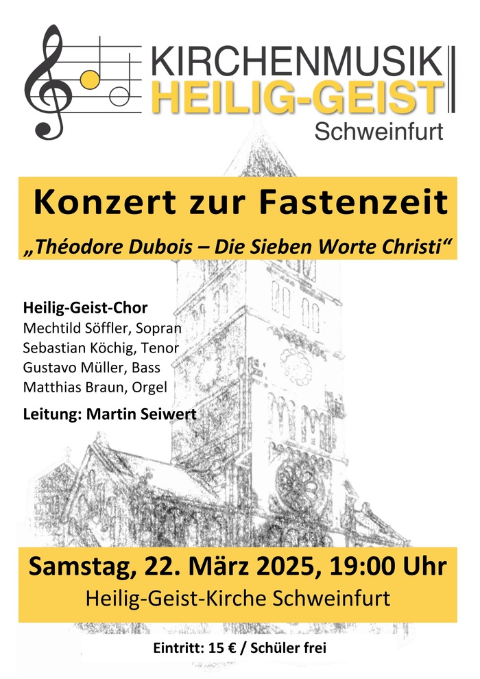 Ein besonderes Highlight erwartet die Besucher am Samstag, den 22. März 2025, um 19:00 Uhr. Der Heilig-Geist-Chor unter der Leitung von Martin Seiwert führt das ergreifende Oratorium „Die Sieben Worte“ des französischen Komponisten Théodore Dubois auf. Dieses Werk, das in Frankreich einst zu den bekanntesten Passionsmusiken zählte, wird in der Fassung für drei Solisten, Chor und Orgel erklingen.Neben dem Heilig-Geist-Chor werden Mechtild Söffler (Sopran) Sebastian Köchig (Tenor) und NN .Bariton) sowie Matthias Braun (Orgel) musizieren. Der Eintritt für das Konzert beträgt 15,-- €, Schüler haben freien Eintritt.