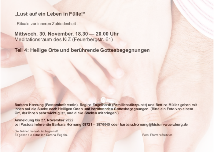 Bei unseren ersten Abenden „Entspanntes Sein“ und „Lebendige Sinnlichkeit“ und "Wertschätzende Selbstliebe" sind wir dem Leben in Fülle schon auf die Spur gekommen. Wir haben uns dabei bewusst gemacht, dass wir ganz Mensch sind, aus Leib und Geist und Seele zusammengefügt und von Gott gemeint und geliebt.