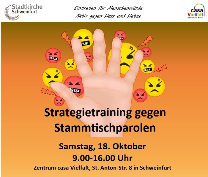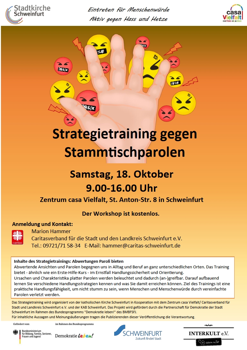 Das Strategietraining wird organisiert von der katholischen Kirche Schweinfurt in Kooperation mit dem Zentrum casa Vielfalt/ Caritasverband für Stadt und Landkreis Schweinfurt e.V. und der KAB Schweinfurt. Das Projekt wird gefördert im Rahmen der „Partnerschaft für Demokratie“ der Stadt Schweinfurt und dem Interkult e.V. Für inhaltliche Aussagen und Meinungsäußerungen tragen die Publizierenden dieser Veröffentlichung die Verantwortung
