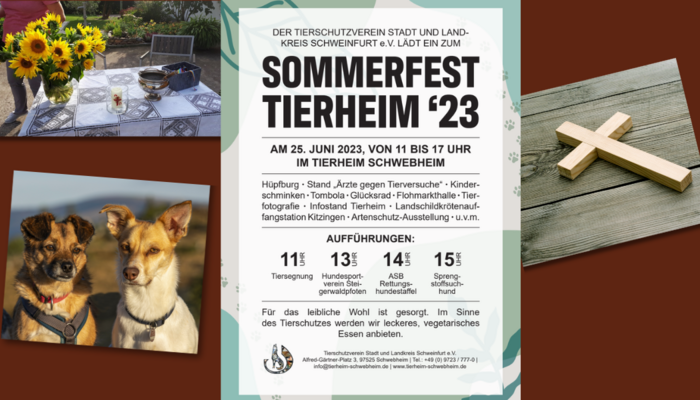 Für alle Tierliebhaber und -besitzer besteht die Möglichkeit, den jeweiligen Vier- oder Zweibeiner, unter Gottes Zuspruch und Schutz zu stellen. Beim Gottesdienst um 11.00 Uhr wird Diakon Joachim Werb (Gemeindeleiter St. Anton, Schweinfurt) auf Einladung des Tierschutzveriens Stadt und Landkreis Schweinfurt e. V. im Rahmen des Sommerfestes nach einer kurzen Wortgottesfeier die Tiere der Besucher segnen, so sie es möchten. Das Sommerfest des alljährliche Tierschutzvereins bietet dazu eine hervorragende Möglichkeit. Besonders liegen dem "Tierdiakon" aber die Tiere im Tierheim am Herzen, die einen besodneren Einzelsegen im Anschluss erhalten. Tierschutz ist auch eine Form des aktiven Gottesdienstes, bringt er doch die Würde aller Kreaturen vor Gottes Angesicht ins Bewußtsein und ist die konkrete Seite der spirituellen Dimension der Liebe Gottes zu seiner gesamten Schöpfung.