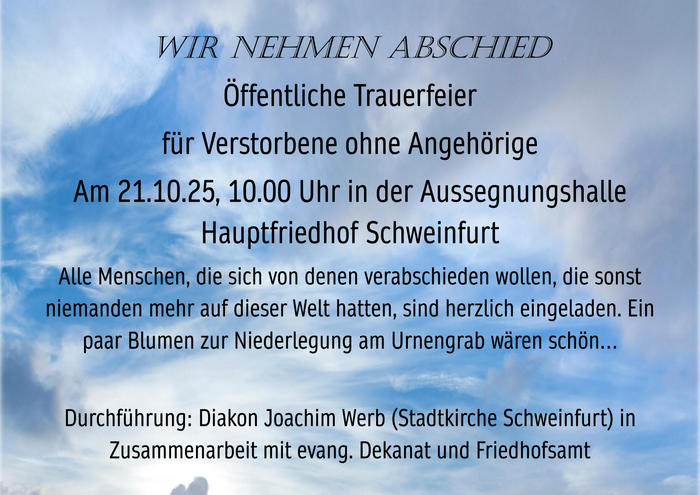 Die halbjährige Reihe der besonderen „Trauerfeier für Menschen ohne Angehörige" wird im Oktober fortgesetzt. Am Dienstag, 21. Oktober, um 10 Uhr in der Aussegnungshalle im Hauptfriedhof Schweinfurt trifft man sich zum gemeinsamen Abschiednehmen.