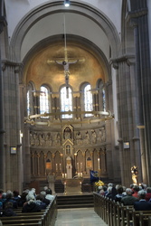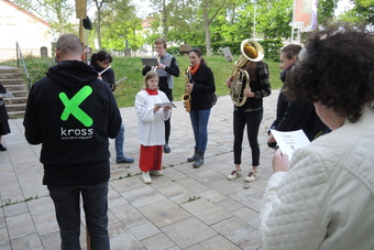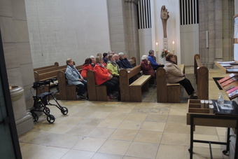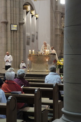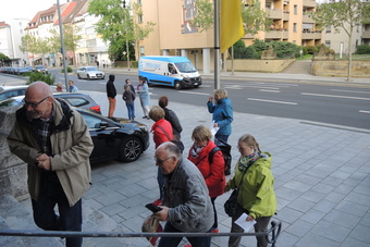 Dort feierte man dann zusammen den Abschlussgottesdienst, der die Gedanken und Impulse der Texte von unterwegs aufnahm. Was es heißt, leben zu dürfen, in Gesellschaft, Glaube und Kirche und wo auch die Herausforderungen in den Bereichen liegen, das konnte unterwegs meditiert, besungen und ins Gebet genommen werden. Situationen in der Stadt Schweinfurt, Menschen mit ihren Geschichten und Schicksalen, sowie die Situation der Stadtkirche markierten den Bezugsrahmen der textlichen Angebote. Wie Jesus Leben ermöglicht, erläuterte Kaplan Bertram Ziegler in der Ansprache am Beispiel des blinde Bartimäus. Selbst dem, der gesellschaftlich, gesundheitlich und in seinem Glauben ausgegrenzt und eben nicht mehr lebensfähig war, eröffnet Jesus eine neue Chance. “Verlass dich auf deinen Glauben! Leg alles ab, was dich daran behindert frei zu sein! Und: werde wieder sehend! Diese Aufforderungen gingen nicht nur an den blinden Bartimäus, sondern an jeden, der sich auf den Weg in die Kirche gemacht hat. Der entscheidende Wendepunkt für Bartimäus ist nach der Zusage Jesu die eigene Aktivität, die Bartimäus auf Jesus zugehen lässt. Diese Dynamik ist Vorbild und Ansporn auch für uns. Die Kraft des Glaubens, die Leben ermöglicht und den Satz “Leben darf…” in vielfältiger Weise positiv ergänzt, wurde als Wunsch und Zuspruch von Bertram Ziegler allen mit auf den Nachhauseweg gegeben.