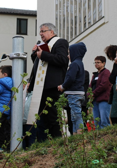 Die alte Bezeichnung "Kindergarten" nutze Domkapitular Clemens Bieber, um die Bedeutung des Segens für das Wachsen, Blühen und Gedeihen der Kinder ins Bewußtseinzu bringen. Das dazu auch viel Bewegung und Spass gehört, zeigten die Kinder zum Auftakt mi einem "wärmenden" Bewegungslied. Nach der Segnung, die den besonderen Schutz und die Nähe Gottes für das Spielgelände sichern will, konnten die Kindern noch ihre Wünsche und Bitten vor Gott bringen. Das wohlwollende Nicken, die mitgesprochene Bittformel oder einfach das konzentrierte Mitfeiern der kurzen Segnung durch die multikulturell geprägte Zuhörerschaft zeigte, dass in dieses einnmaligen Zusammenspiel unterschiedlichster Partner in einem Haus gelingt und zum Segen für "alle" werden kann.