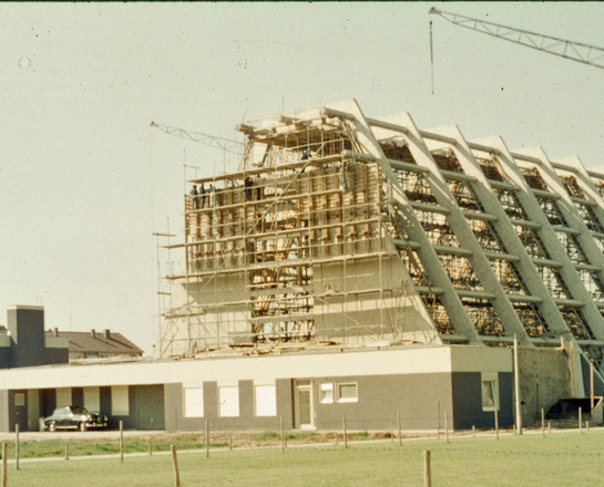 Die großflächigen Giebelfelder aus Sichtbeton werden von hochrechteckigen Glasbetonfenstern durchbrochen. Im Zielpunkt des Raumes erhebt sich eine breite Altarinsel, auf der Gegenseite die Orgelempore. Rechts vom Eingang ist ein Andachtsraum vorgelagert. Der 40 m hohe, freistehende, wuchtige Glockenturm soll das Gotteshaus nach außen markieren.