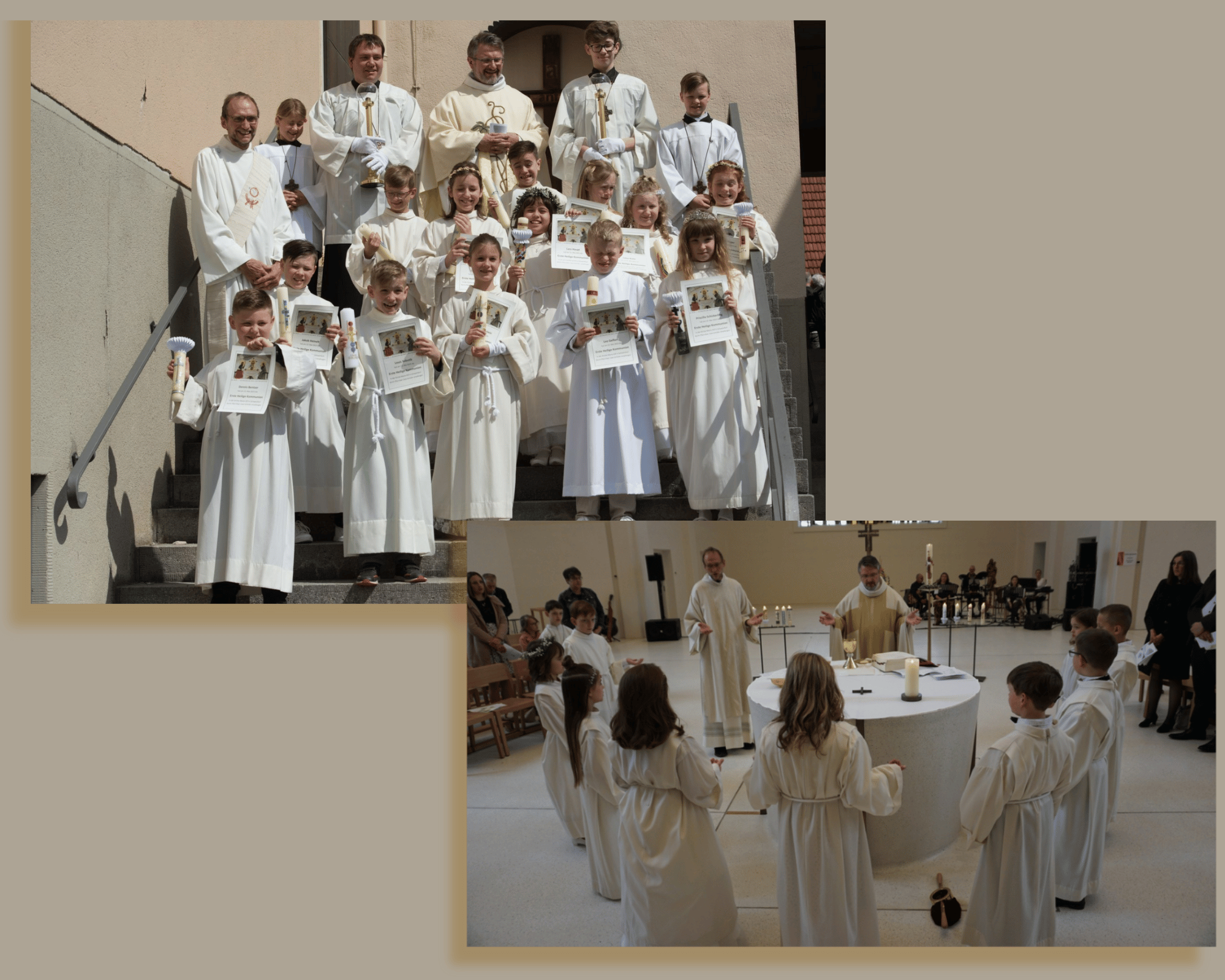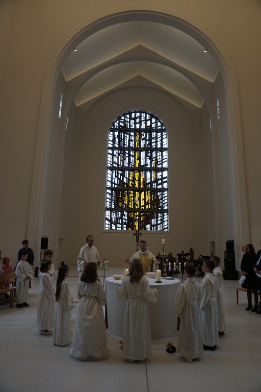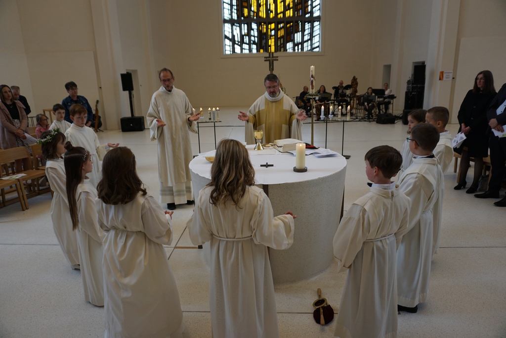 Zusammen mit vielen Gästen, den beiden Bands Spiritu (in Maria Hilf) und Godspell (in St. Anton), den Organisten Christoph Beck an Andrea Eirich, sowie zahlreichen Helferinnen und Helfern vor und hinter den kirchlichen Kulissen wurden zwei ansprechende Gottesdienste gefeiert, die das Emmausgeschehen in besonderer Weise in den Blick nahmen. Zunächst jedoch zogen die Kinder mit ihren Eltern ein, um vor der versammelten Gemeinde die Kommunionkerzen zu entzünden und an die Kinder zu übergeben. Danach wurde das Taufbekenntnis erneuert und das Sakrament der Kommunion als nächster Schritt ins Erwachsensein der Kinder vor Gott qualifiziert. Die Verkündigung des Evangeliums gestalteten einige Kinder selbst, in dem der Weg der Jünger von Jerusalem nach Emmaus spielerisch dargestellt wurde. Eine sehr lebendige und „interaktive“ Ansprache durch Pfarrvikar Uwe Schüller vermittelte allen Gottesdienstbesuchern die frohe Botschaft, dass die Sache Jesu nicht totzukriegen ist und die Freundschaft und Begleitung Jesu bei jeder Eucharistiefeier ganz neu zu erleben ist. „Am Brotbrechen ihn erkennen“ - das ist der Auftrag an die Kommunionkinder, die jetzt seine ganz besonderen Jünger sind. Jesus nahm die Niedergeschlagenheit, die Trauer und die das Nichterkennen seiner Wegbegleitung den beiden Jüngern durch sein Tun beim Brotbrechen. Genau das verspricht er nun auch den Kommunionkindern und allen, die sich auf das gemeinsame Mahlfeiern einlassen.