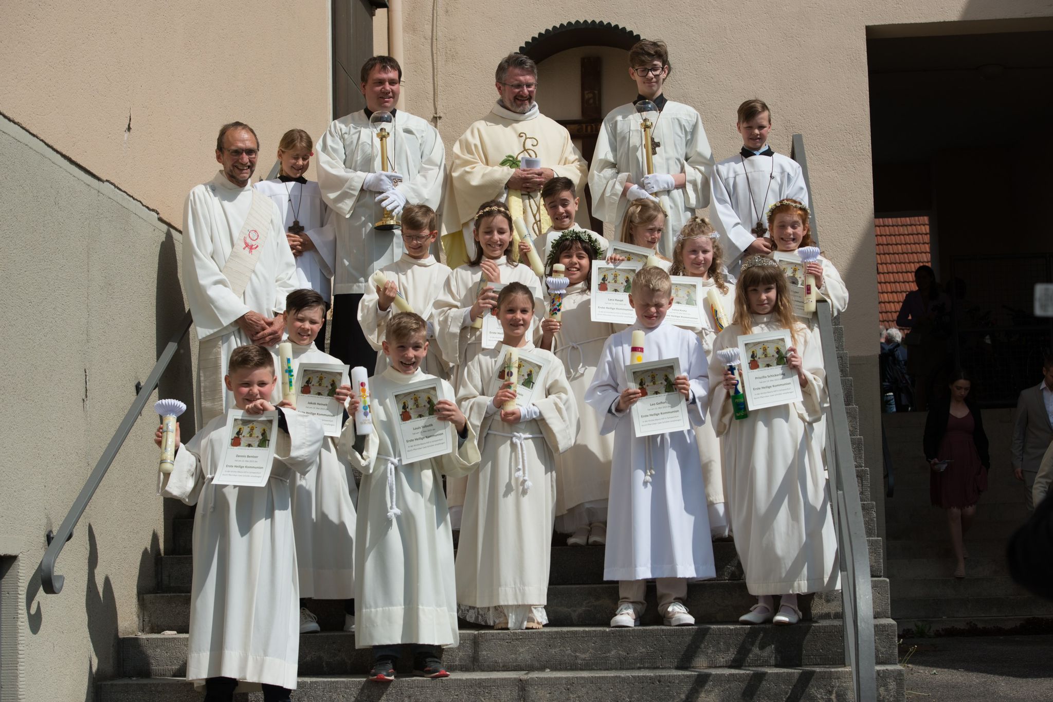 Der feierliche erste Kommunionempfang wurde dann für die Kinder zum Höhepunkt der Feier. Nach gemeinsamen Auszug war dann noch kurz Zeit für ein Gruppenfoto, bevor die zahlreichen Familienfeiern das Fest für alle fortsetzte.