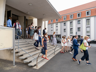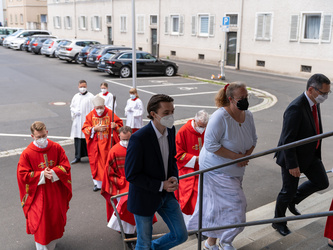 Zusammen mit ihren Paten und Eltern kamen die Firmlinge in die nach Hygieneregeln voll besetzte Kilianskirche. Freunde und Verwandte, die keinen Platz mehr in der Kirche fanden, konnten die Feier von zu Hause aus per live Stream mitverfolgen