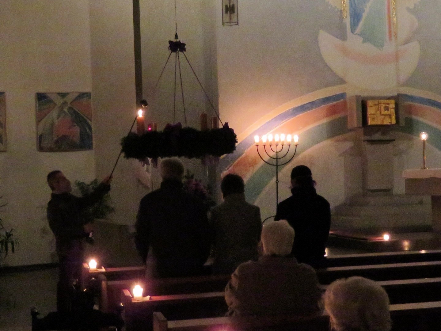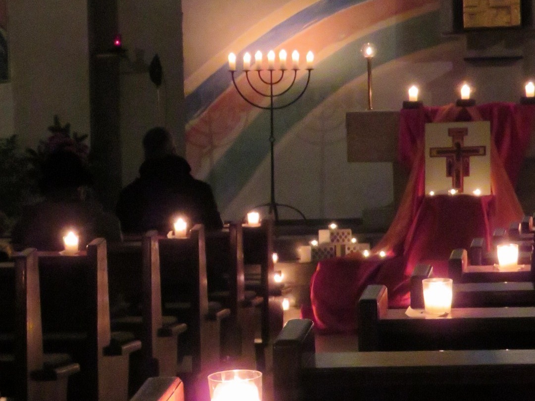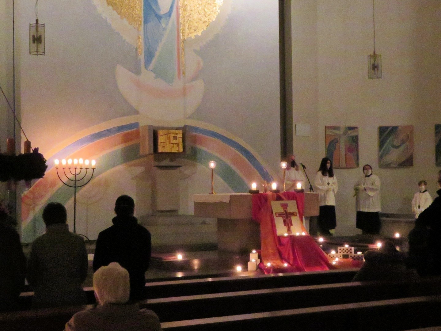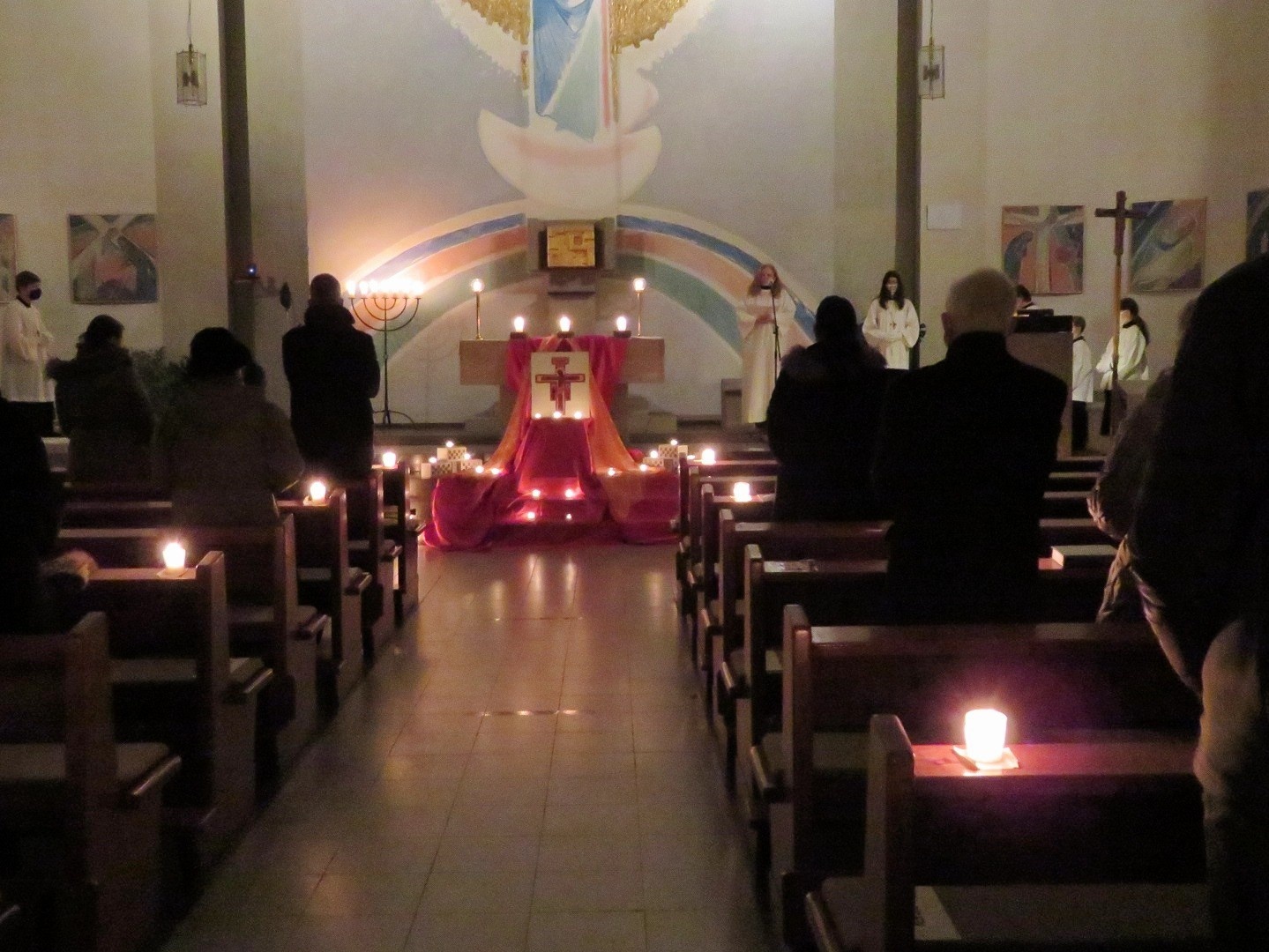 Stimmungsvoll illuminiert mit den Symbolen der Taizé-Tradition verwandelte sich der Gottesdienstraum in eine "Kathedrale der Herzen", die von der Magie und der sichtbaren Wärme der vielen Kerzen lebte. Das besonders gesegnete Licht des Adventskranzes machte den Anfang der Verbindung zwischen Kerzenlicht und Gottes Nähe. Die Botschaft der Ruhe, Besinnung und die Hoffnung auf das Licht vom Himmel wurde eindruckvoll durch die musikalische Begleitung der Familie Beck (instrumental wie vokal) verstärkt und erreichte die Herzen, auch wenn die Hände und Füße bei fehlender Heizung coronabedingt kalt blieben.