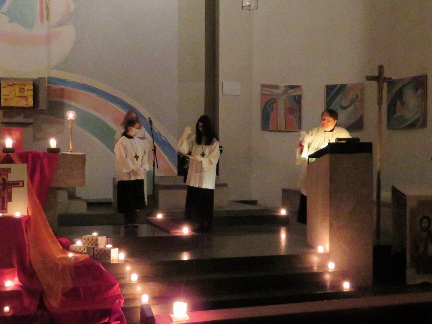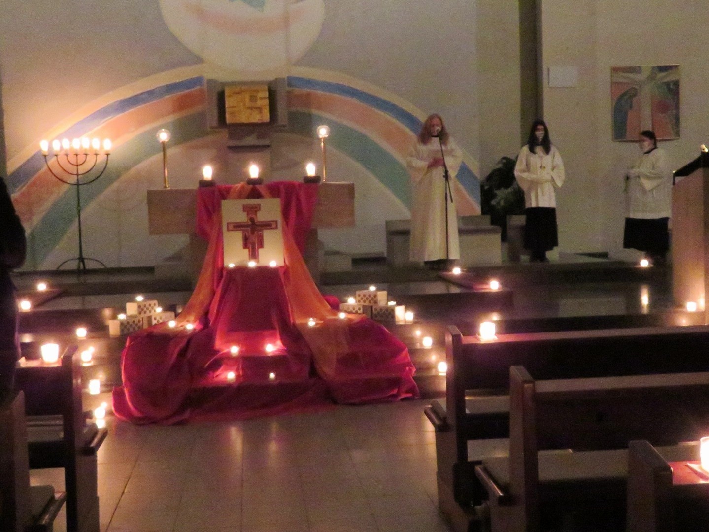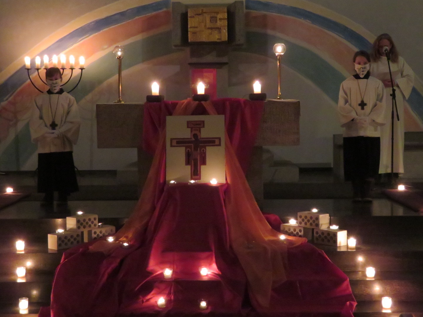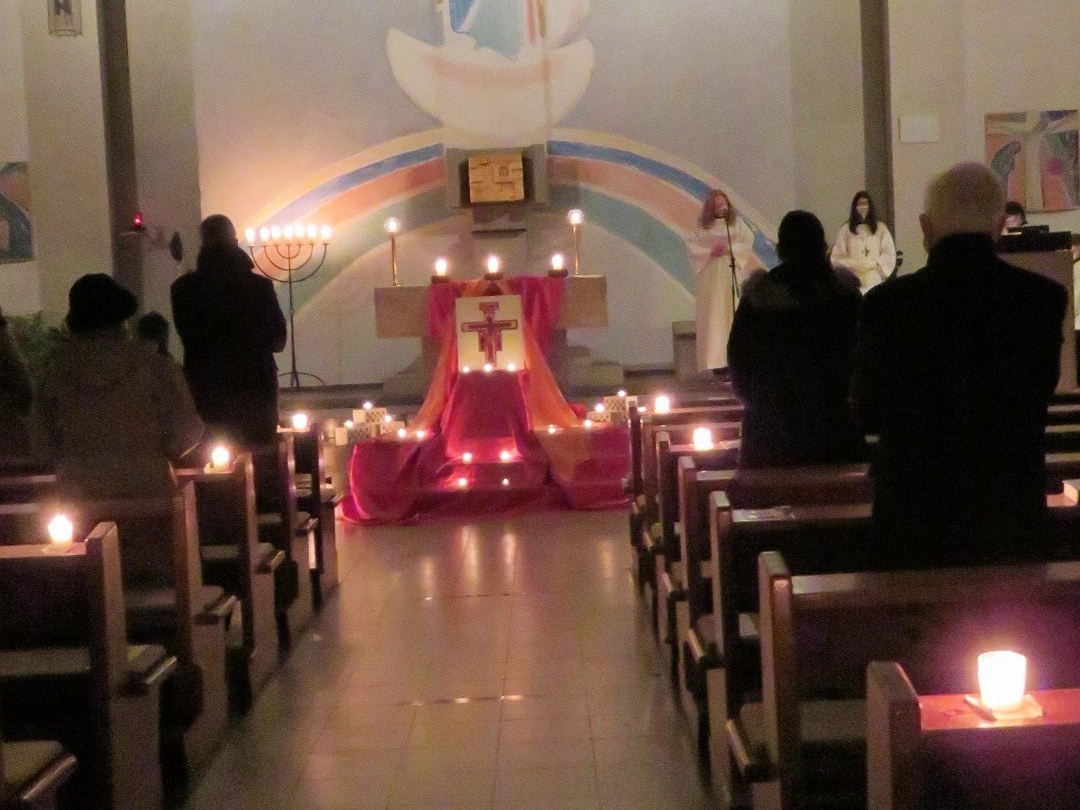 Stimmungsvoll illuminiert mit den Symbolen der Taizé-Tradition verwandelte sich der Gottesdienstraum in eine "Kathedrale der Herzen", die von der Magie und der sichtbaren Wärme der vielen Kerzen lebte. Das besonders gesegnete Licht des Adventskranzes machte den Anfang der Verbindung zwischen Kerzenlicht und Gottes Nähe. Die Botschaft der Ruhe, Besinnung und die Hoffnung auf das Licht vom Himmel wurde eindruckvoll durch die musikalische Begleitung der Familie Beck (instrumental wie vokal) verstärkt und erreichte die Herzen, auch wenn die Hände und Füße bei fehlender Heizung coronabedingt kalt blieben.