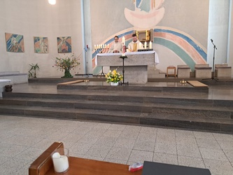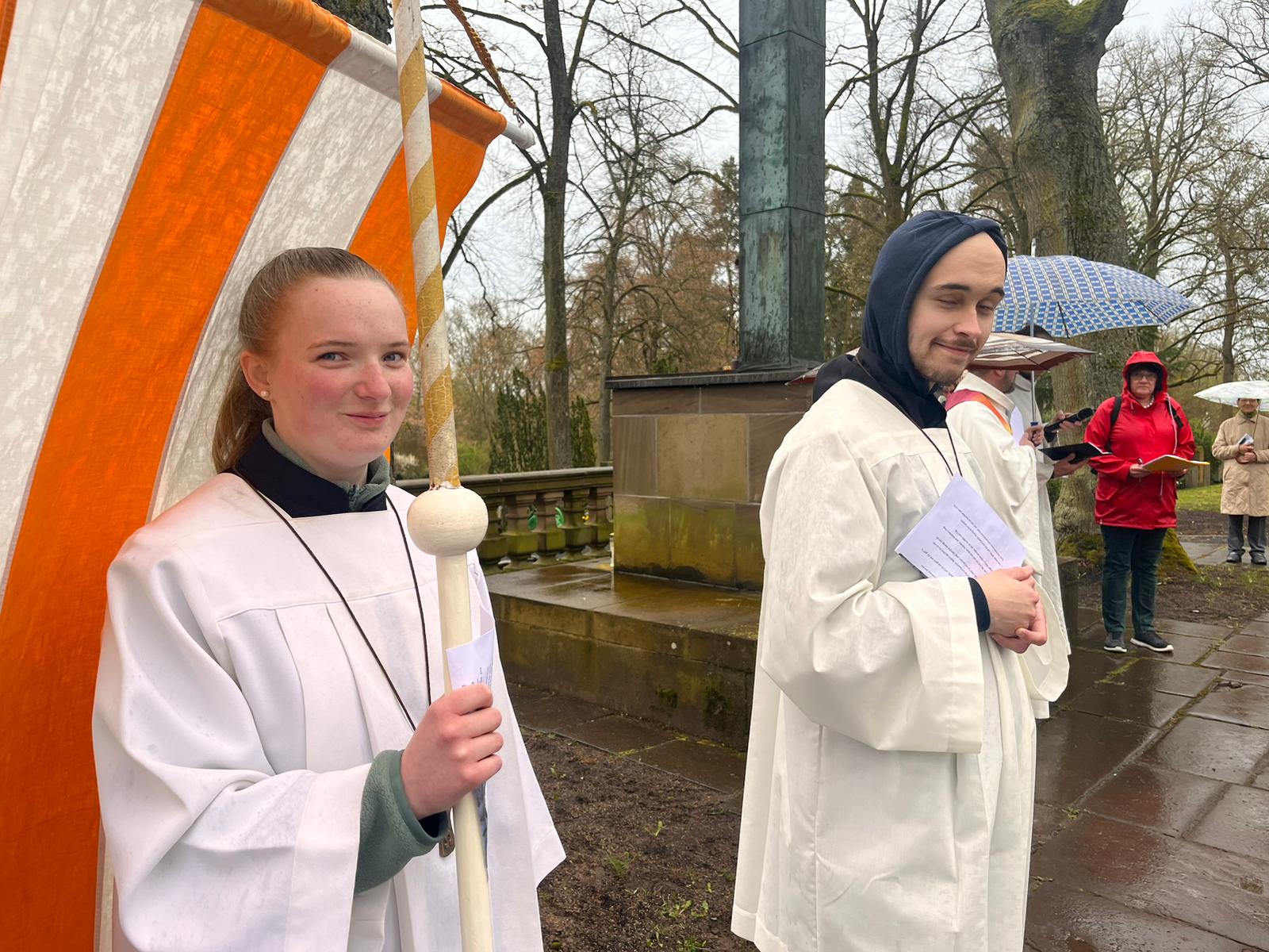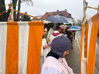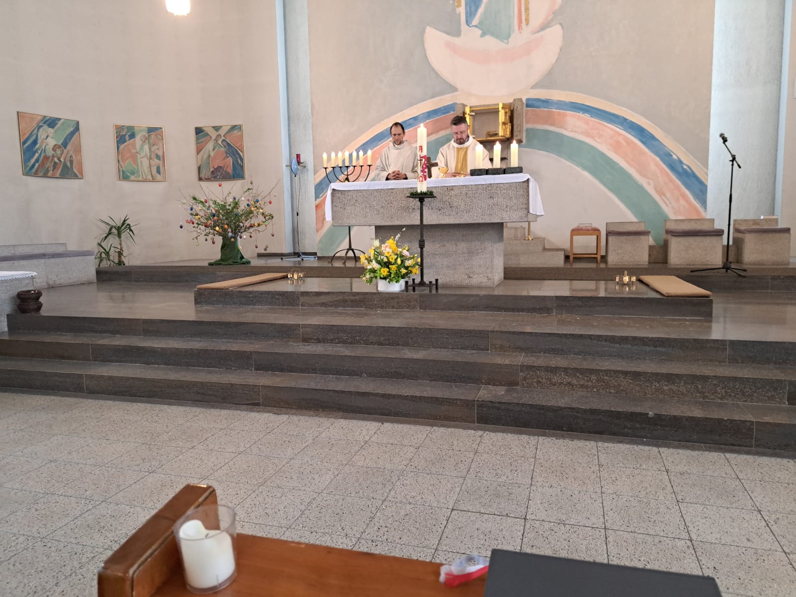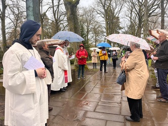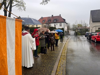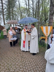 Zu Beginn hörten die Teilnehmenden das Lied „Auf und davon“ von Christina Stürmer. Der Liedtext beschreibt Gefühle, die wohl auch die beiden Jünger kannten als sie sich nach Jesu Tod auf den Weg nach Emmaus gemacht haben. Unermessliche Trauer und Perspektivlosigkeit kommen zur Sprache. Aber es gibt auch Textpassagen, die die verwandelte Stimmung der Jünger nach der Begegnung mit Jesus ausdrücken könnten. Nach erklärenden Worten machten sich die Teilnehmenden bei strömendem Regen auf den Weg. Sie nahmen die Frage mit, ob auch sie schon einmal ineiner Situation waren, in der sie am liebsten davongelaufen wären. Für eine weitere Strecke stand die Frage nach dem Ziel und der Wegbegleitung zur Diskussion. An einer der Stationen wurde der Begriff „Emmaus“ neu definiert. Er ist nicht an Ort und Zeit gebunden, sondern beschreibt ein Geschehen. Emmaus ist überall dort, wo in der zwischenmenschlichen Beziehung die Gegenwart Gottesspürbar wird. Dies kam auch in den Texten auf dem letzten Wegstück zum Ausdruck. Die Teilnehmenden zogen bei Glockengeläut in der Kirche Maria Hilf ein, wo sie bereits von zahlreichen Menschen erwartet wurden. Diese wurden mit Hilfe einer kurzen Zusammenfassung über das Geschehen auf dem Weg informiert, ehe Vikar Uwe Schüller mit allen die Messe feierte.