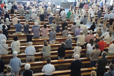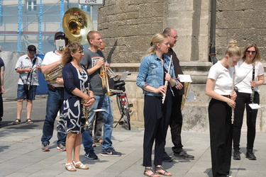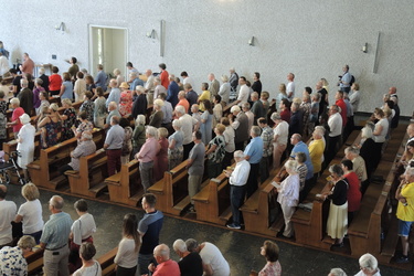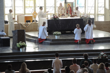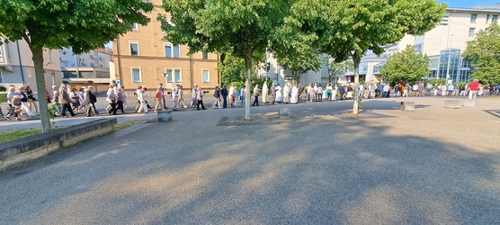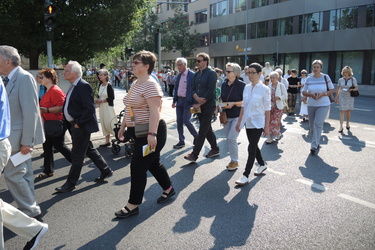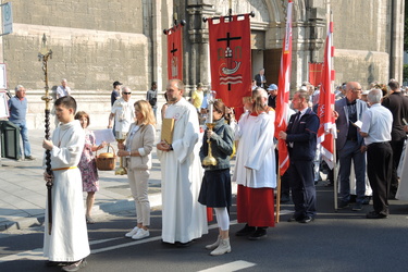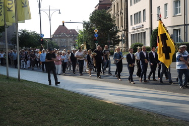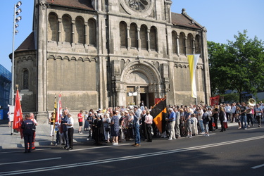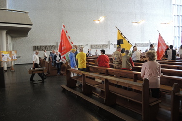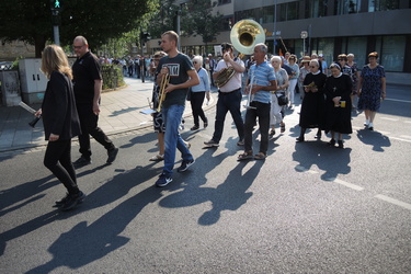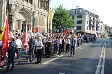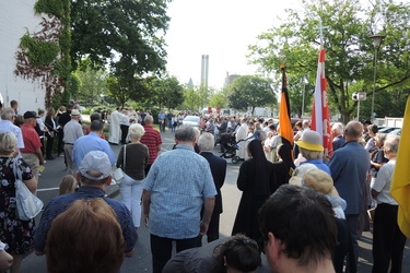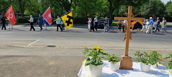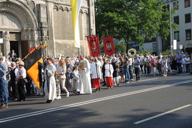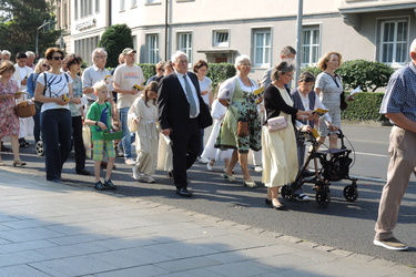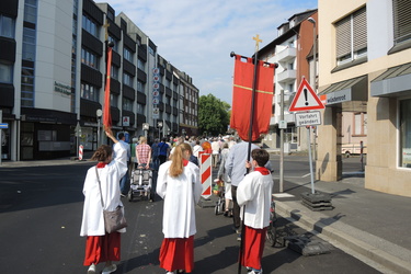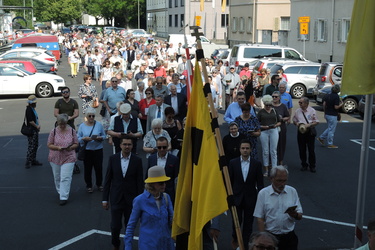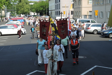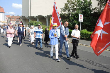 An der Prozession nahmen unter anderem Fahnenabordnungen von Caritas, Malteser Hilfsdienst, Katholischer Arbeitnehmer-Bewegung (KAB) und Kolping sowie Oberbürgermeister Sebastian Remelé teil.