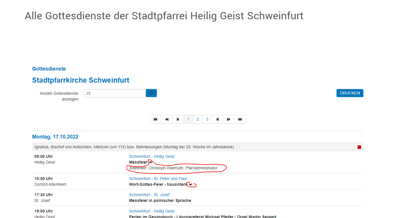 Auf der Homepage unter "Gottesdienste" bei den Terminen auf den schwarzen Pfeil nach unten klicken --> es öffnet sich ein Fenster mit dem Zelebranten (siehe Bild)