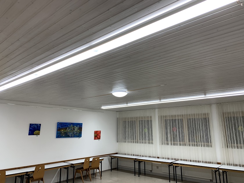 Aufgrund der finanziellen Situation hat sich die Kirchenverwaltung für eine kleine Lösung entschieden. Vielen Dank an die Bastelgruppe und den Frauenbund für die Spenden, die uns ermöglicht haben, dass der Clubraum in einem neuen und geräuscharmen Licht erstrahlt. Außerdem ist die Beleuchtung nun energiesparend durch LED-Technik."