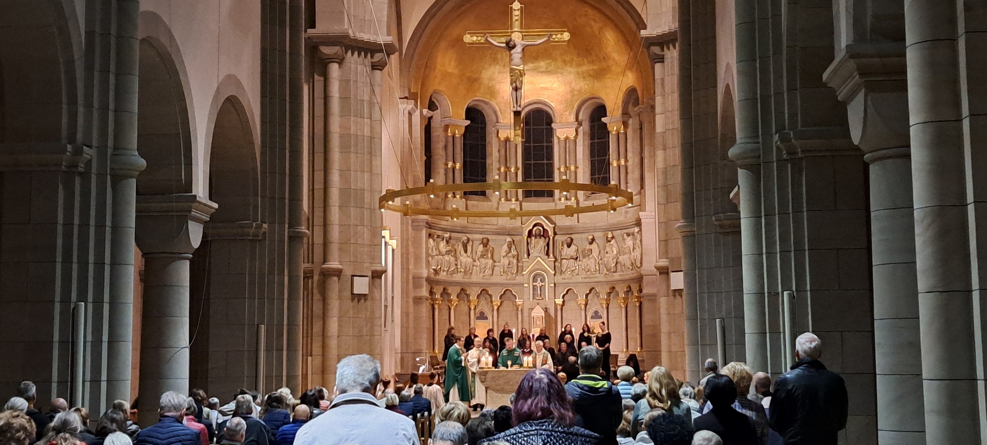 Gerade diese emotionale Seite des Gottesdienstes wurde durch die hochkarätige und gewohnt professionelle Begleitung des Heilig-Geist-Chores unter Martin Seiwert „bedient“. Außergewöhnliche Werke (Colin Mawby: Messe in G-Dur; Vytautas Miškinis: Exultate Deo) waren dabei ebenso zu hören, wie inspirierend begleitete Gottesloblieder für alle. Der Musik im Gottesdienst schenkten auch die beiden scheidenden Seelsorger großes Augenmerk. So war diese Darbietung schlüssig und es kam einmal mehr die Bedeutung der musikalischen Gestaltung für die stimmige Atmosphäre einer gottesdienstlichen Feier zum Ausdruck.