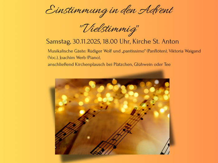 Der Grundakkord des Advents wird bei dieser vielstimmigen Stunde am ersten Adventswochende zu hören und zu spüren sein. Diakon Joachim Werb mit seinen Gästen bietet zu den Tönen, Liedern (auch zum Mitsingen) und „Klängen“ ein besonders vielseitiges Programm für Ohr und Herz an. Klassiker der Adventszeit, beeindruckende „mehrstimmige“ Panflötenstücke und die markante Bluesstimme von Viktoria Waigand bieten neben den Textimpulsen viele Möglichkeiten, abzuschalten, umzuschalten und den Advent als echte Umkehrzeit bei sich ankommen zu lassen.
