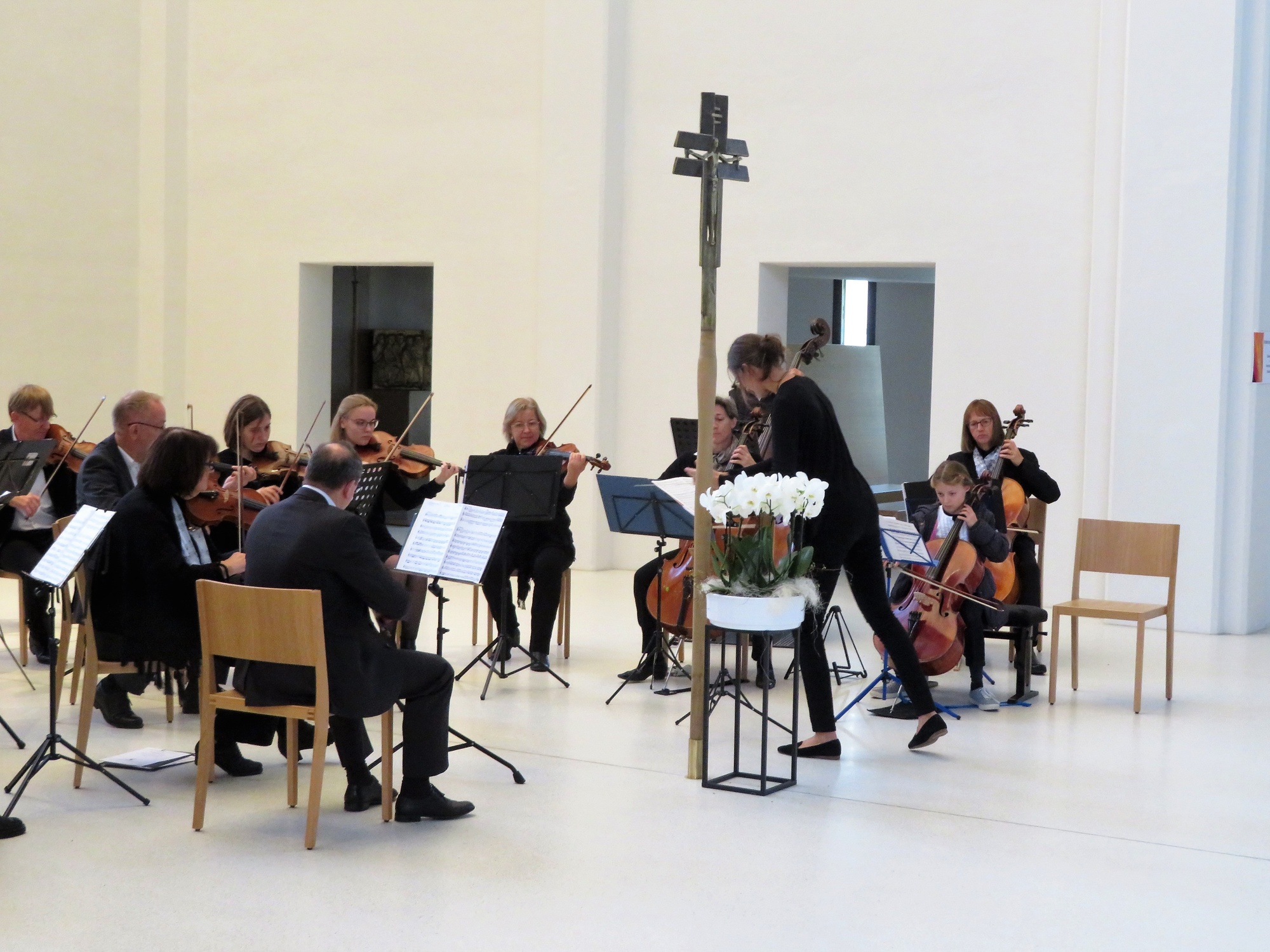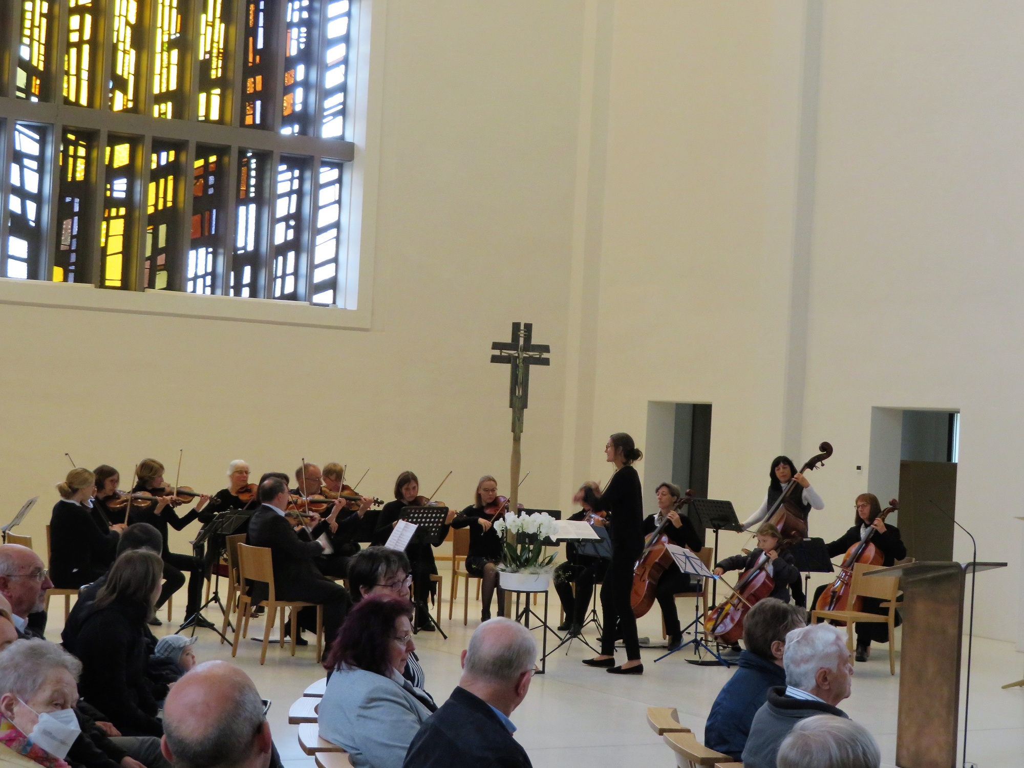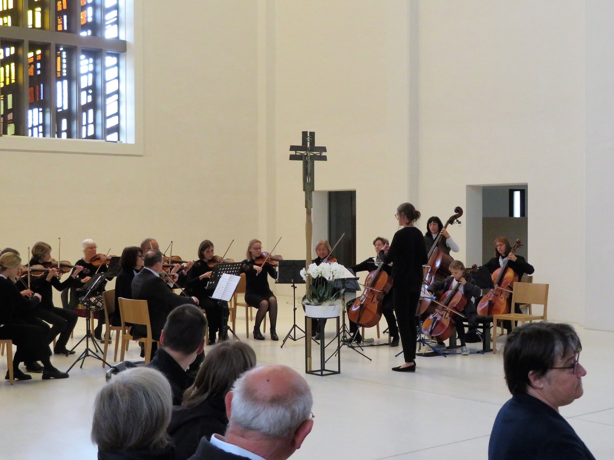 Dass diese gelingen kann, zeigte unter anderem der hohe Zuspruch, den der im Anschluss angebotene Geburtstagssekt bekam. Viele der kanpp 200 Besucher blieben noch eine kleine Weile, ließen die professionellen und stimmungsvollen Klänge des Kammerorchesters mit Werken von Antonio Vivaldi und Valentin Rathgeber nachwirken und kamen über die Geschichte und Zukunft der Kirche ins Gespräch. Dass die Musik in der Kirche eine Zukunft hat, bewies die wohl jüngste Solistin, die je in St. Anton gehört wurde. 8 Jahre alt und schon ein Cellosolo präsentiert, und das so gekonnt, alle Achtung! Ein Extraapplaus für die Tochter der Dirigentin, aber auch der langanhaltende Beifall für das Orchester selbst zeigten, dass sich die Qualität des Orchesters auf höchstem Konzertniveau befand und dass die neue Akustik diese Art der Musik sehr gut unterstützt.