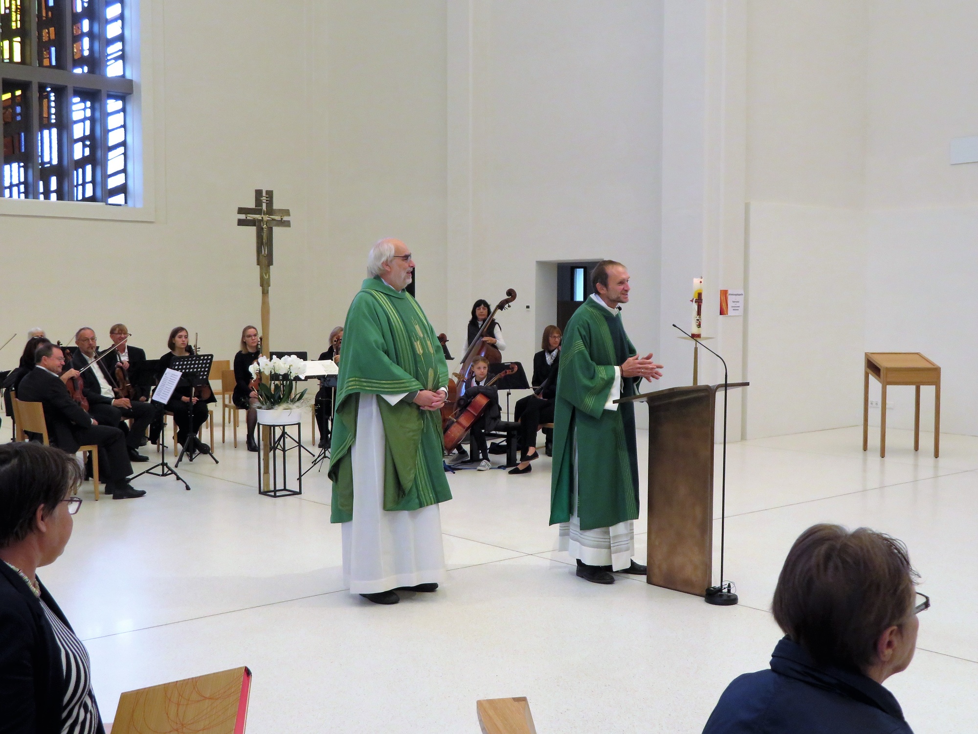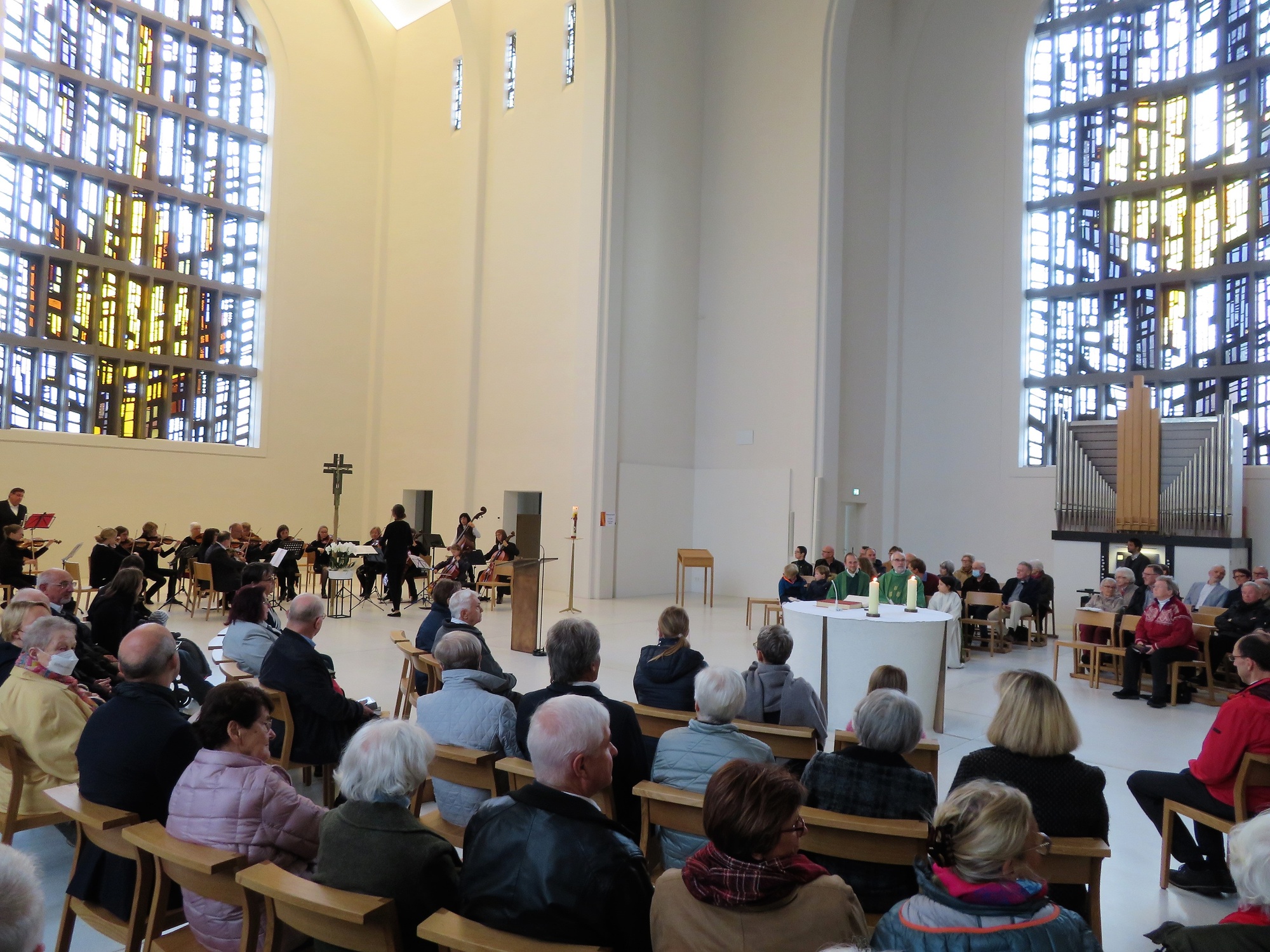Denn zunächst markierte eine voll besetze Kirche, in die sogar noch zahlreiche Zusatzstühle herbeigeschafft werden mussten, das erfreuliche Ambiente des Jubelgottesdienstes. Eingeladen dazu waren neben den Antöner Gemeindemitgliedern alle Gläubigen der Stadt Schweinfurt und - als musikalischer Höhepunkt - das Kammerorchester Schweinfurt unter der Leitung von Frau Christina Drost. Alle kamen, zahlreich, in bester Feierlaune und mit der Bereitschaft, einen wirklich besonderen Gottesdienst zu erleben. Einer konnte leider krankheitsbedingt nicht teilnehmen:der angekündigte Festprediger Prof.Martin Ebner. Dafür sprang spontan Pfarradministrator und Domkapitular Christoph Warmuth ein und gab der Feier gekonnt und mit eigenem Stil seine besondere Note.