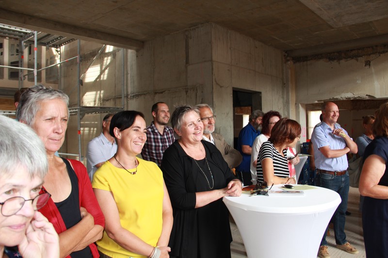 Man hielt inne und erinnerte sich an Geschichte und Planungsschritte des Großprojekts. Viele Institutionen waren und sind an der Planung und Ausführung beteiligt (Bischöfliches Ordinariat Würzburg, Bischöflicher Stuhl zu Würzburg Kdö, Kirchenstiftung St. Anton, Architekturbüro Brückner&Brückner Würzburg, Caritasverband für die Stadt und den Landkreis Schweinfurt) und kümmern sich um das weitere Gelingen des „Leuchtturmprojekts“ in der Diözese Würzburg. In allen Ausführungen kamen der Grundgedanke des Zentrums „Vielfalt leben“ zum Ausdruck. Diakon Joachim Werb (Gemeindeleiter St. Anton) und Architekt Christian Brückner erläuterten dazu den Geist und die Idee des neuen Gebäudes,das tätige Hilfe für den Menschen (Caritas) und Gottesdienst in vielfältiger Form (Kirche und Liturgie) zusammenbringen will. Im Mittelpunkt steht der Mensch, der mit Gott und sich selbst in heilsame Verbindung gebracht werden soll.