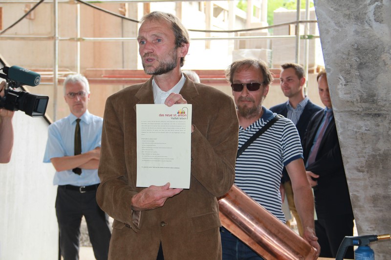 Der Grundstein für dieses pastorale und architektonisch zukunftsweisende Projekt wurde symbolisch mit einer reichlich bestückten „vielfältigen“ Zeitkapsel gefüllt, gesegnet und im zentralen Eingangsbereich des Gebäudes im Boden verankert. Im Anschluss kam in einer eigens für „das neue st. anton“ kreierten „Vielfalthmyne“ musikalisch zum Ausdruck, was später auf diesem Grundstein und in den Mauern gelebt werden und passieren soll.