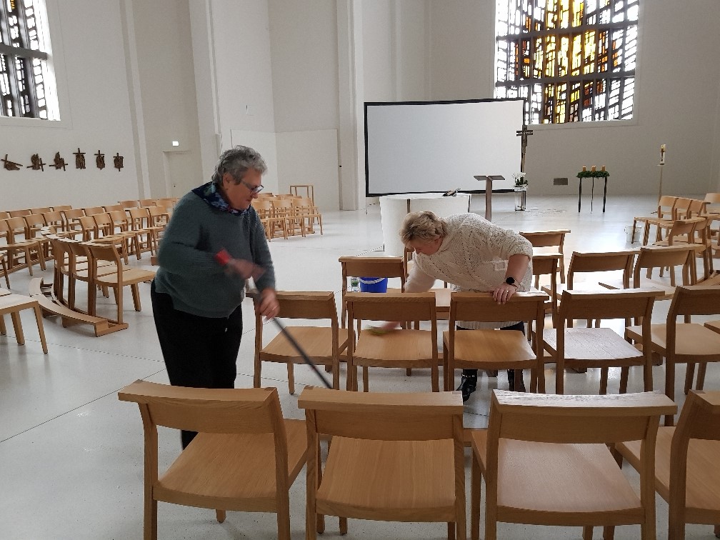 Justina Schulz und Rosalia Roman, bewaffnet mit Wischtuch und Schrubber, reinigten den Kirchenraum. Die beiden sind schon viele Jahre aktiv und kümmern sich auch um den Kirchenschmuck. Rosalia Roman erzählte eine Episode aus ihrer Erinnerung. In der alten Blumensakristei war es immer kalt. An einem Wintertag vor Weihnachten hatte Frau Häring einen kleinen Heizlüfter mitgebracht. Zuerst funktionierte die Wärmequelle gut, plötzlich ein Knall, das Licht war aus und der Lüfter stand. Ein weiteres Heinzelmännchen brachte die Sache wieder in Ordnung.