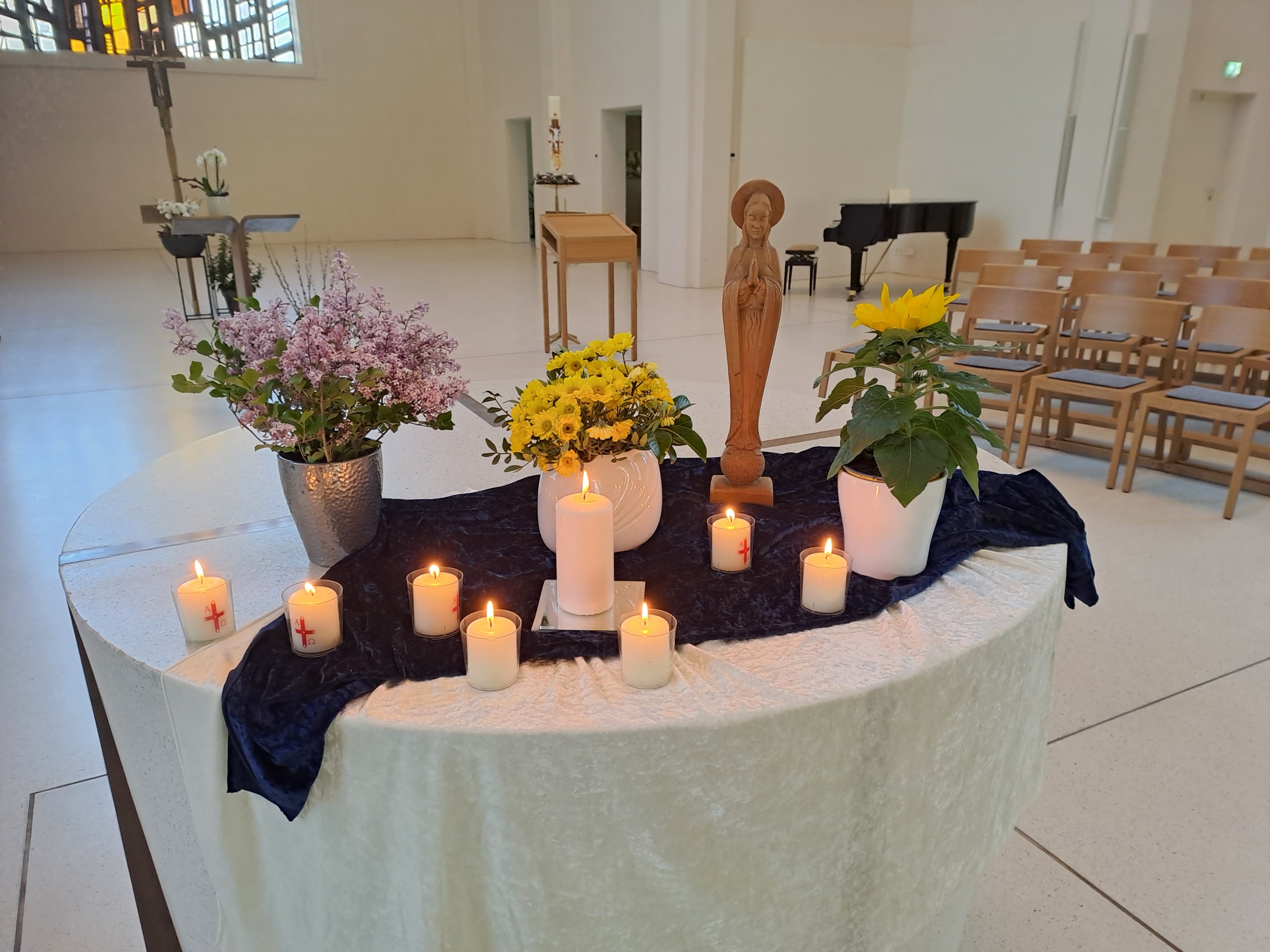 Eva-Maria Oettinger lud die Anwesenden ein, die Marienfigur auf dem Altar näher zu betrachten und Überlegungen anzustellen, nach welchem Vorbild der Künstler sie geschaffen haben könnte. Sie erinnerte an die Tradition des Maialtars, der früher in den meisten christlichen Haushalten während des Monats Mai zu finden war. Gabi Treutlein gab sieben kurze Impulse zur Person Mariens. Für jeden einzelnen Gedanken wurde eine brennende Kerze auf den Altar gestellt. Kerzen, bunte Blumen und die Marienfigur ließen den Altar für den Rest der Feier zum Maialtar werden.
