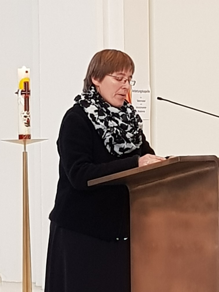 In die Tiefe, ja buchstäblich unter die Haut ging dabei dann die dialogische Schilderung von Fluchtschicksalen durch die beiden Gäste. Prominent und kompetent in der Sache, einfühlsam und authentisch im Auftreten, leidenschaftlich und engagiert im Handeln, so konnten alle Mitfeiernden die weithin bekannte Franziskanerschwester und ihre Begleitung erleben. Die Fragen des weitgehend in Gedichtform gehaltenen Dialogs konnte jeder auch an sich selbst gestellt sehen. Was ist Heimat, wo ist Heimat, wann bin ich fremd, wo bin ich aufgenommen?