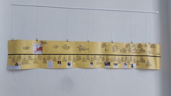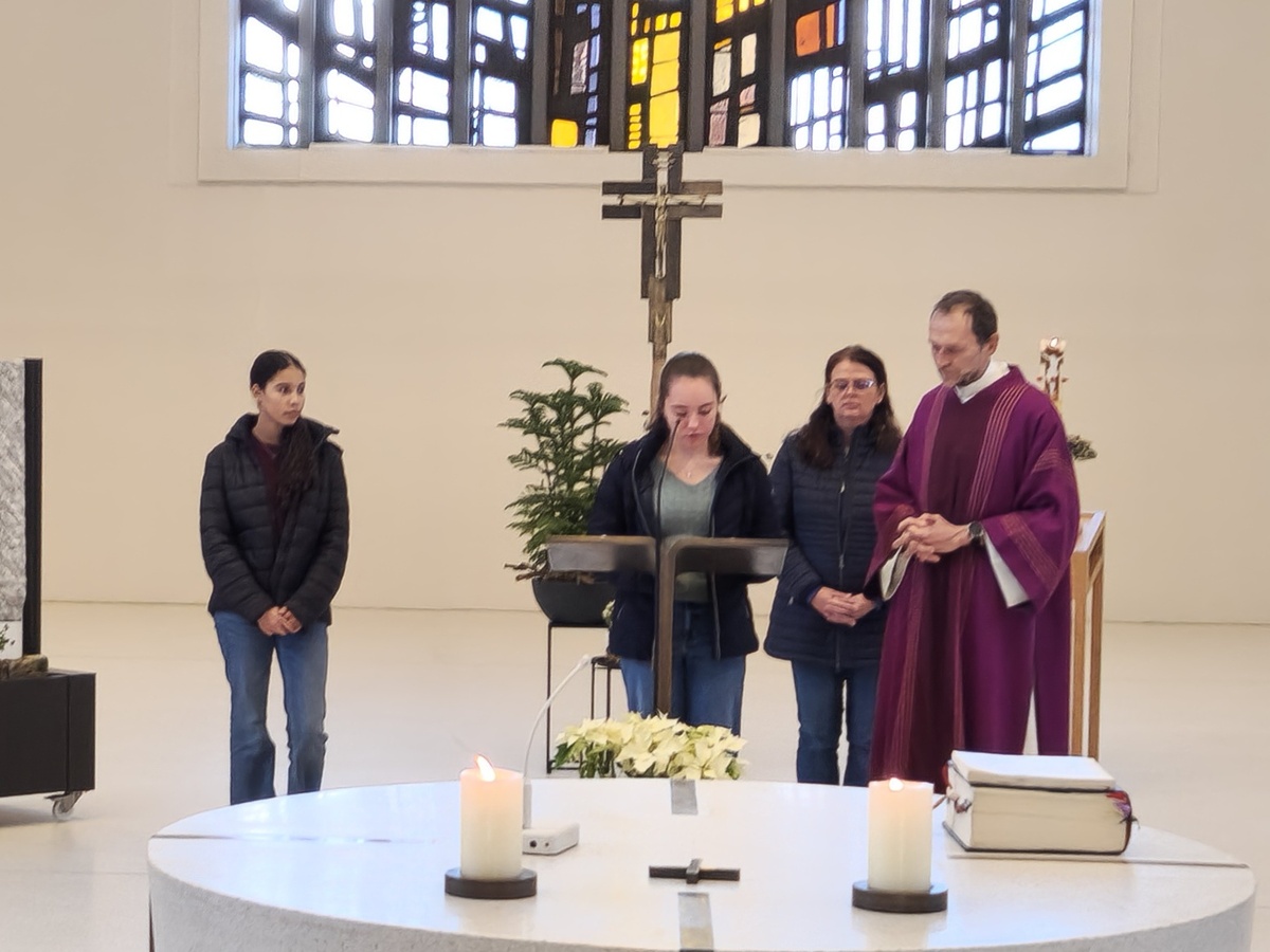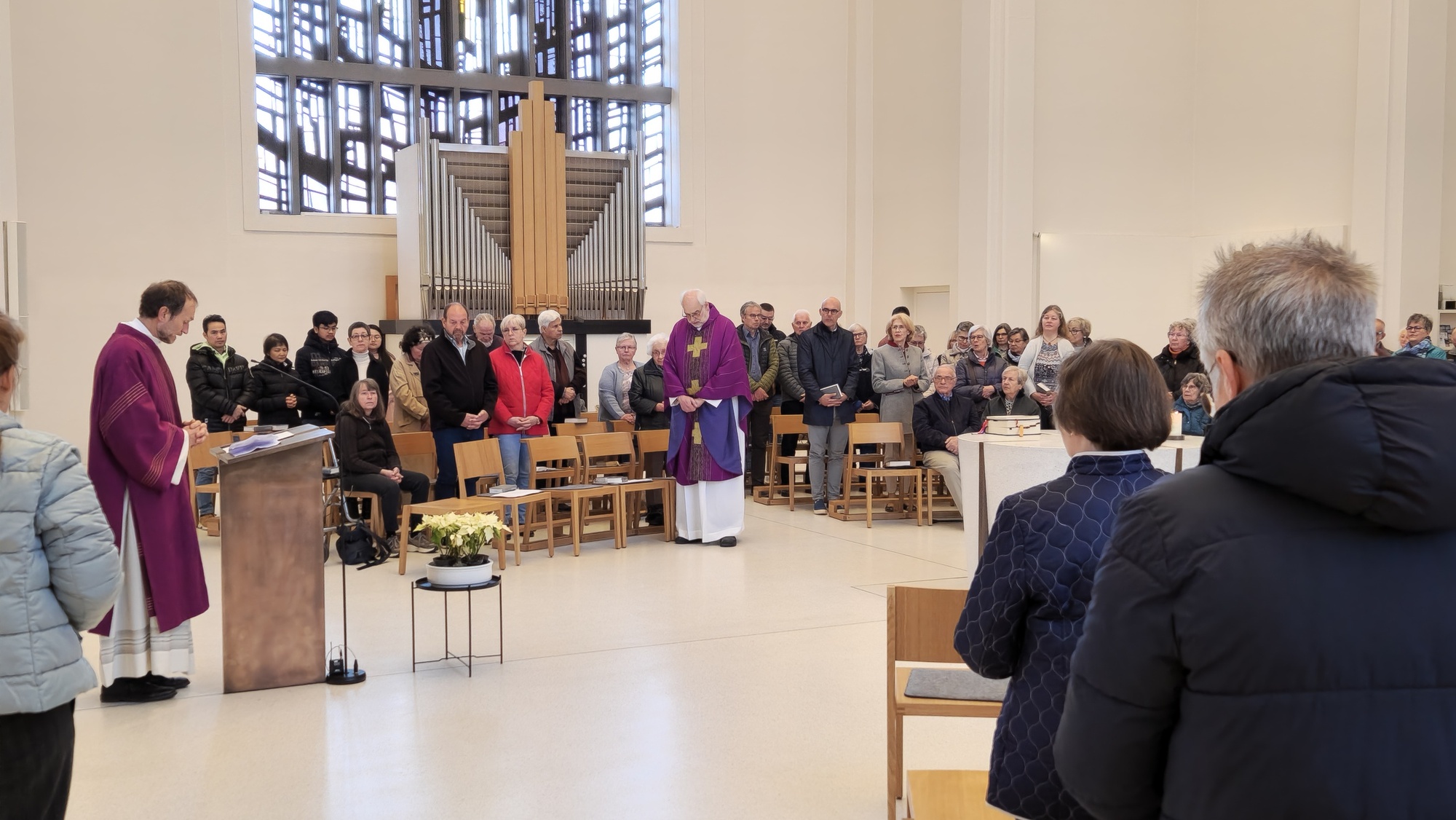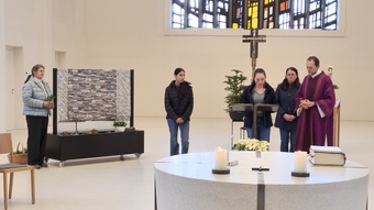 Im Laufe des Gottesdienstes wurde die "Mauer" auf Rollen durch den Kirchenraum bewegt und bei den Fürbitten mit Blumen geschmückt. Nach der Kommunion gab es einen Impuls der Hoffnung, dabei wurde die Mauertapete entfernt und die Besucherinnen und Besucher eingeladen, ihre Hoffnungsgedanken zu teilen und die Wand mit bunten Blüten der Hoffnung aufblühen zu lassen.