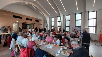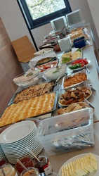 Nach dem Gottesdienst konnten die Gäste im Antoniussaal beim gemeinsamen Brunch mit den internationalen Spezialitäten gemütlich ins Gespräch kommen. Zu den rund 40 angemeldeten Gästen, die die Veranstaltung im Programmheft der Schweinfurter Frauenwochen entdeckt hatten, kamen noch rund 40 Gäste, die sich durch den Gottesdienst spontan herzlich eingeladen fühlten. Schnell wurde durch das Team des casa Vielfalt einige extra Tische aufgestellt, so dass alle einen Sitzplatz fanden.