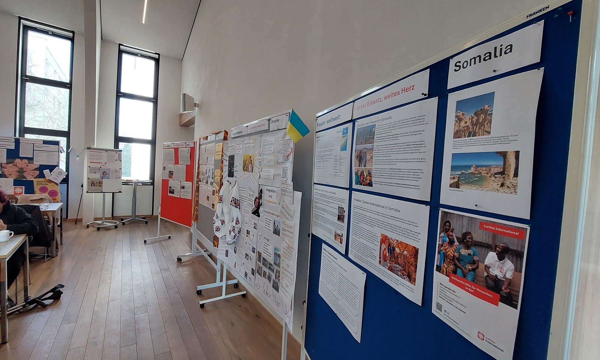 Schon im Gottesdienst um 10.30 Uhr, mit vorbereitet durch Mitarbeiterinnen des Caritasverbandes Schweinfurt, ging es um die Rechte der Frauen in der Welt. Im Eingangsbereich hatten sie eine "Mauer" errichtet, kreativ gestaltet aus einem Blumenkasten mit Windfang, der mit Mauertapete zugehängt war. Diese störende "Dekoration", die störend mitten im Weg stand, erzeugte manches Stirnrunzeln. Die Aufklärung erfolgte bei der Hinführung, bei der Marion Hammer, Koordinatorin des Zentrums casa Vielfalt erklärte: